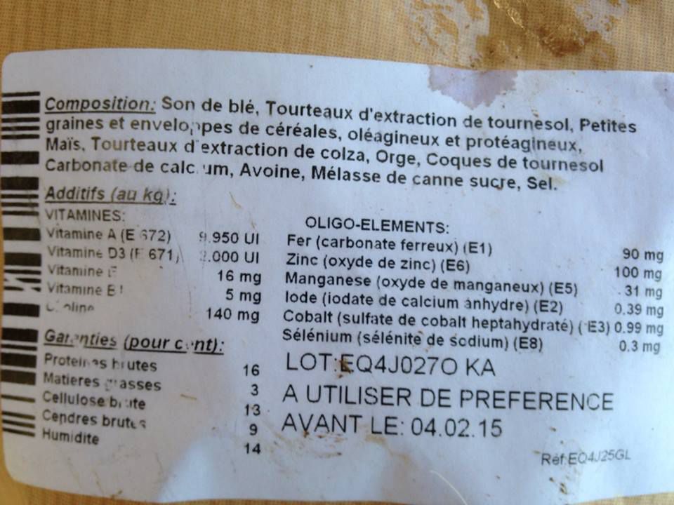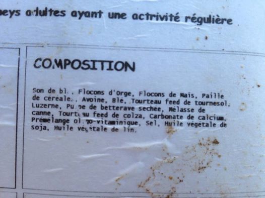| Dire merci | Donc comme prévu, voilà la compo du destrier : ![]() " alt="" /> et la compo d'un sac que j'ai acheté hier dans une coop, sans marque spéciale : [url=https://www.1cheval.com/membre/services/photos/images/177538.jpg" class='zoombox zgallery2059207' ] ![]() [/url]" alt="" /> voilà !!! |