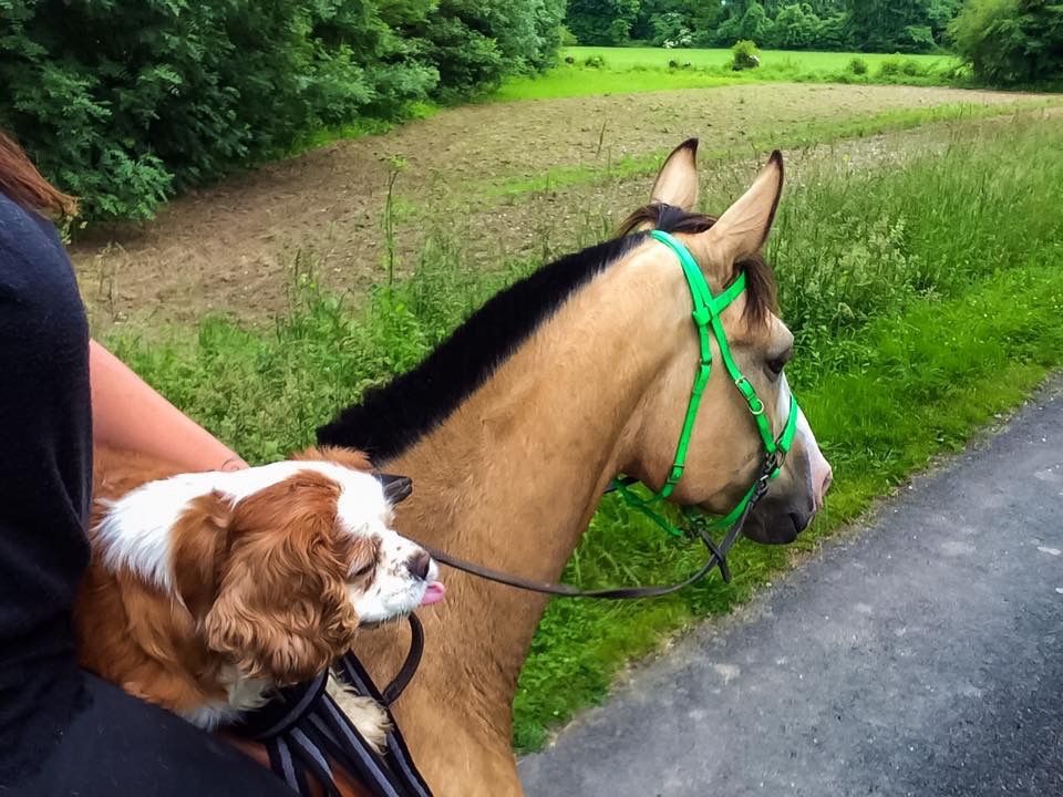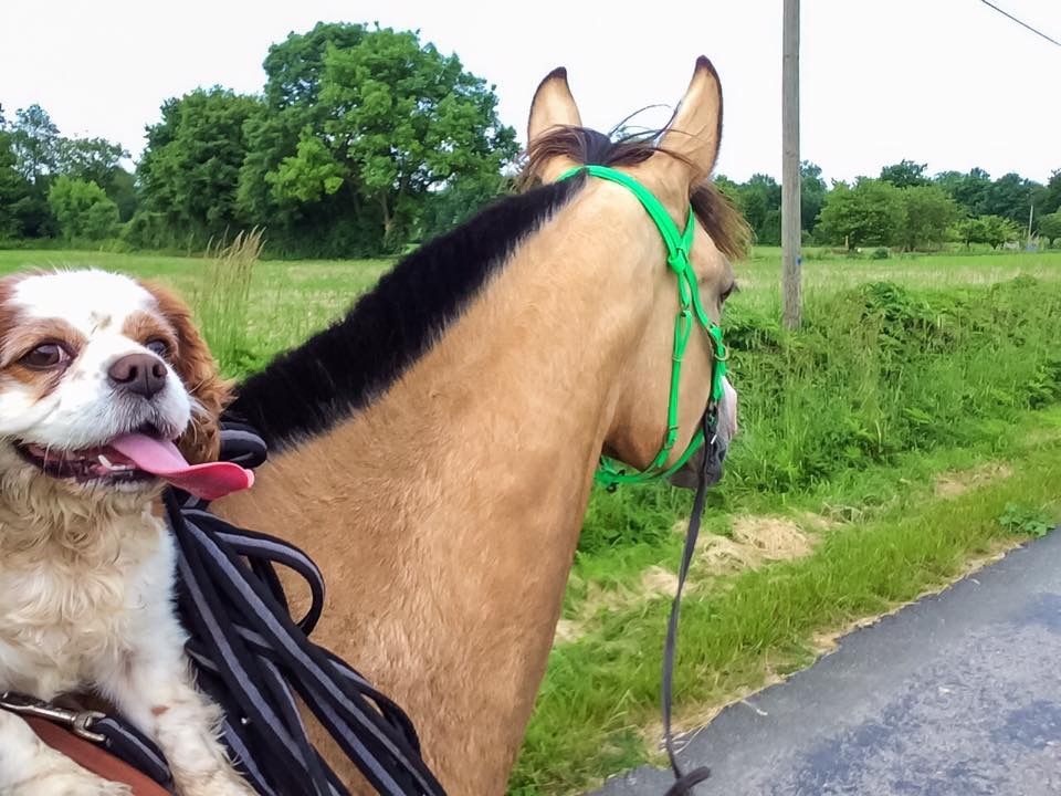 | Dire merci | Aujourd'hui petite sortie de 6km pour préparer la rando de dimanche !! Accompagnée des trois chiennes, une BD au top et un Poy en super forme !! Au bout de 3km, Eden ne suivait, elle fatiguée et marchée a plus de 100m de nous, je décide donc de la prendre avec moi, à cheval pour les trois derniers bornes !! Ma grosse Doune a était EXEMPLAIRE !! J'étais rênes longue car je devais tenir la chienne et aussi le poney en longe !! Bref une vraie expédition, mais je préfère ça, que laisser ma chienne !!! |