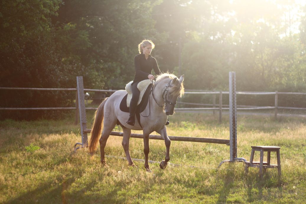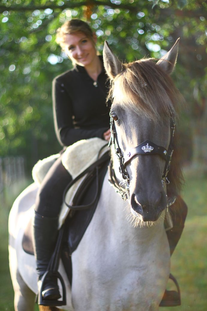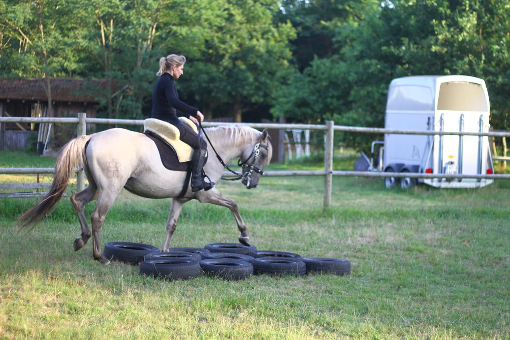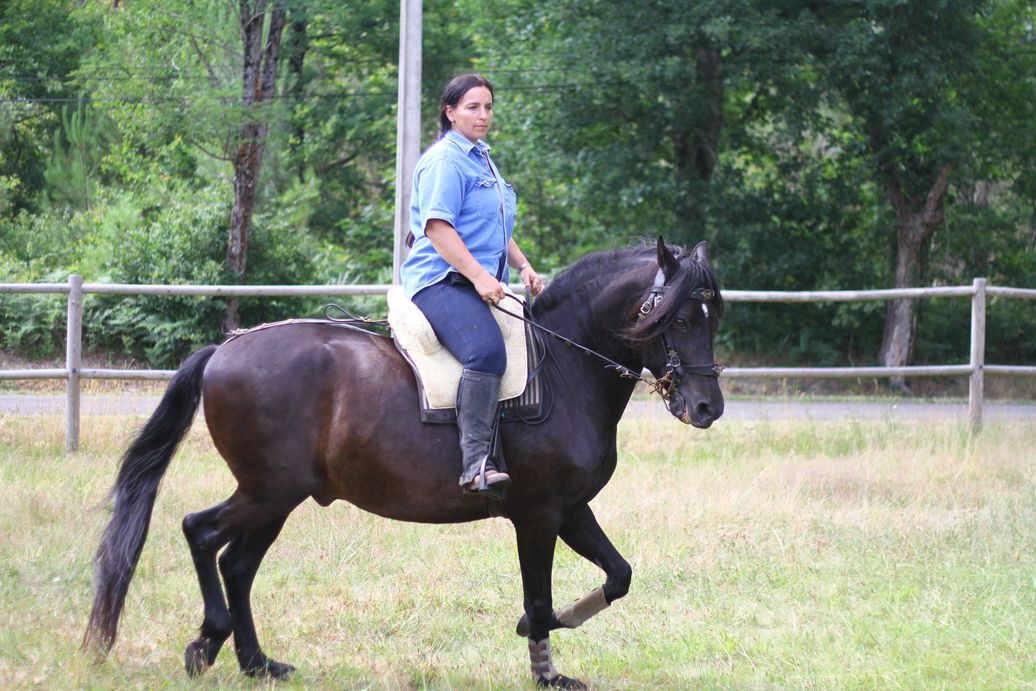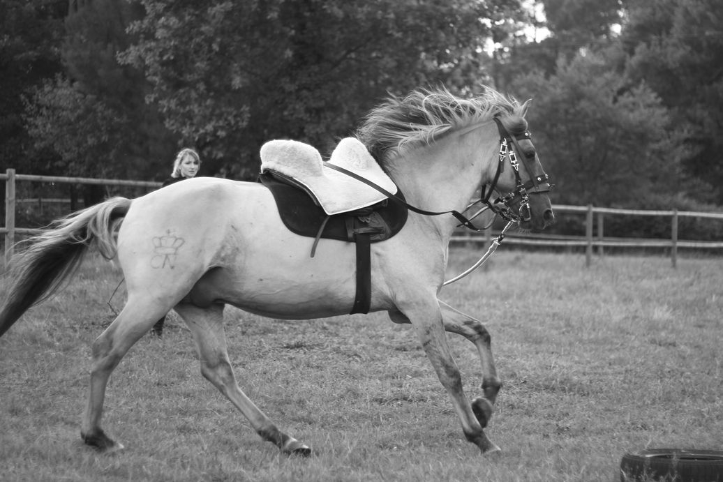 | Dire merci | Non, je ne l'avais pas pris en photo "habillé" là bas, dommage ![]() Et en effet, la selle avance, malgré le tapis qui devrait l'en empêcher ![]() Oui, Erzie, après je ne suis pas une grande dresseuse, je fais du cheval pour mon plaisir, Dové n'ira jamais faire de concours, ce qui m'intéresse c'est le loisir, c'est à dire un cheval cool, confortable, agréable à monter, souple, qui se tient tout seul (la plupart du temps je suis rênes longues). Et j'arrive bien à donner de fines indications avec le goyo. On va l'amener aux qualifications loisir parce que même si je dis qu'il est cool tant qu'il n'y aura pas la preuve on ne me croira pas, donc voilà, mais après je le laisserai éduquer ses poulains comme le faisait Daou, j'espère qu'il aura le même instinct. Mon but est de faire naitre de bons chevaux de loisir, les 3 nouveaux, de par leurs origines sont certainement capables de plus, si les proprios des poulains veulent aller plus loin, ils pourront, mais je ne prétends pas vendre des bêtes de concours ![]() Ma seule prétention est de vendre des chevaux jolis (quand on aime les ibériques, bien sûr ) bien dans leur tête, bien soignés et manipulés. La qualif loisir rentre dans cette optique donc il va y être présenté, mais je ne tiens pas à l'emmener passer plein de concours, je préfère qu'il reste au pré avec ses poulains.Là on travaille Dové pour le préparer aux qualif loisir donc les séances sont plus axées sur les différents "obstacles" de qualif, pas sur du dressage académique. C'est en septembre, on a relativement peu de temps et comme je ne peux plus monter seule (ma jambe droite ne répond plus, quelqu'un doit me hisser à cheval et si le cheval fait le zouave je ne suis pas sure de tenir correctement) je ne peux pas le travailler Je souhaite qu'il puisse être guidé à 1 main sur des rênes longues (non, je sais, c'est pas académique) mais en loisir c'est pratique et le goyo est parfait pour ça |