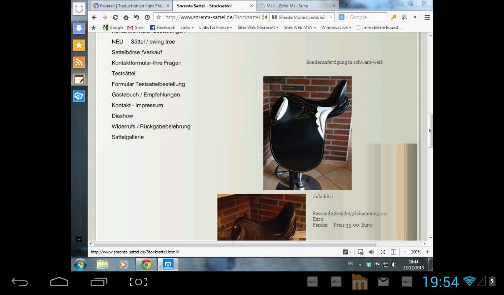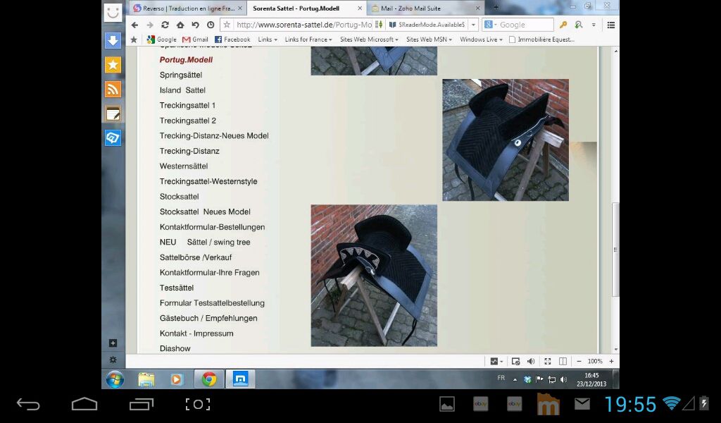 | Dire merci | mes selles sans arçon sont sur le point d'être réalisées : - selle portugaise : noir avec pommeau et troussequin bleu - selle australienne noir avec les oreilles blanches et 10 cm en moins dans la hauteur. Cela fait plusieurs mois que j'utilise le site reverso.net pour traduire mes messages et aujourd'hui j'apprend qu'ils comprennent le français. Désormais ce sera plus simple pour me faire comprendre car apparemment la traduction n'est pas tout à fait fidèle au message français. Vu qu'elles sont sur mesures il faut compter un délais de 6 semaines puis une de plus pour la livraison. |