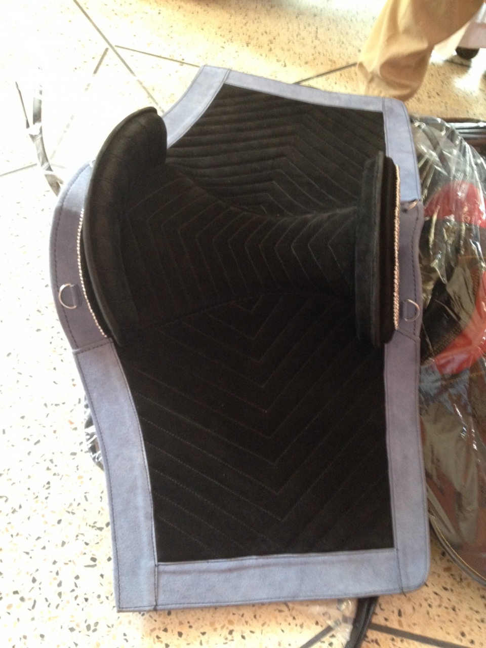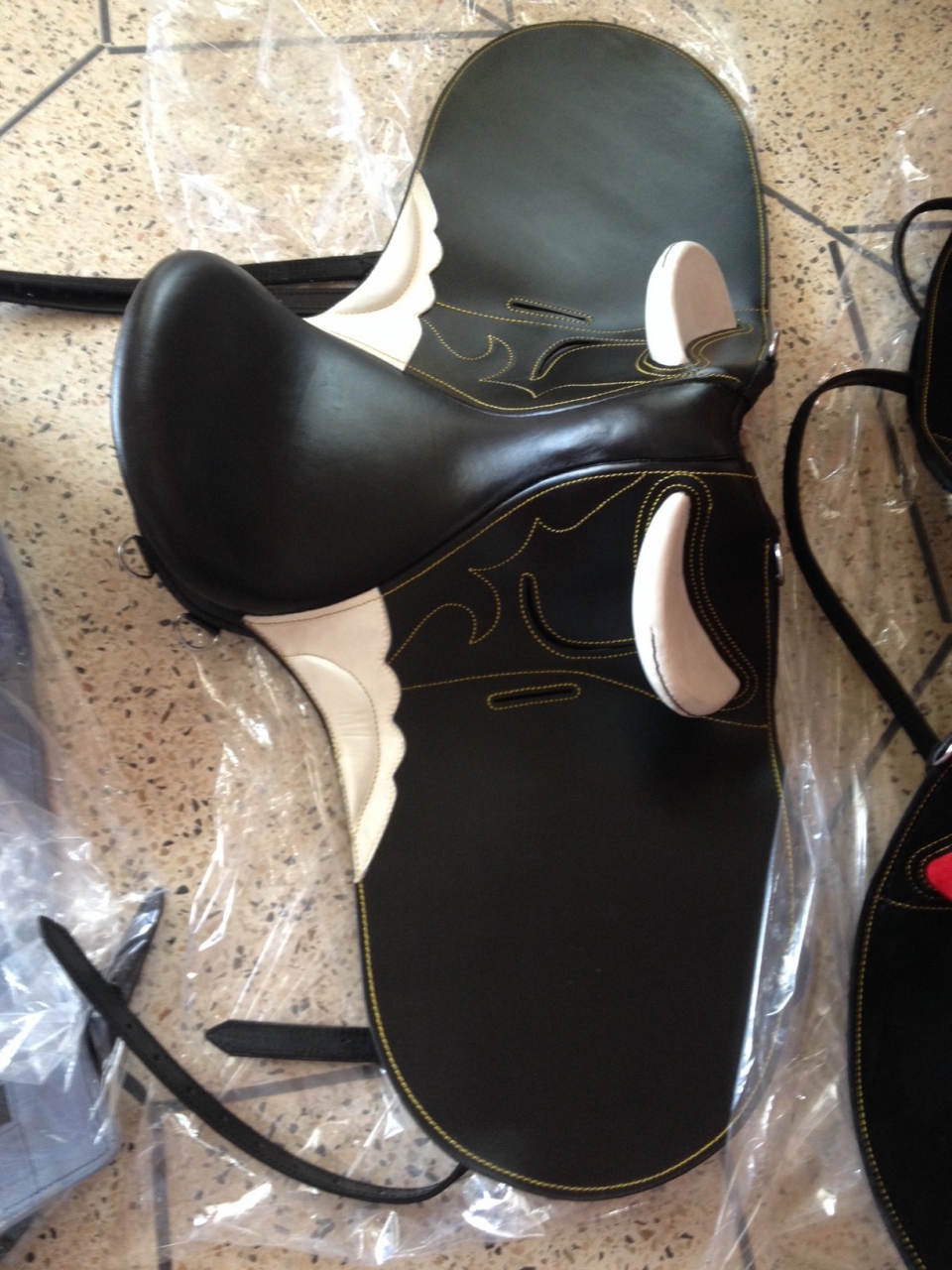 | Dire merci | ![]() Voici les 2 selles que j'ai choisie, pour l'Australienne j'ai demandé que les quartier soient raccourcis de 10 cm ( j'ai le même problème que Nimue. L'Australienne sera en noir et blanc comme la photo et la portugaise en noir avec un décor bleu. |