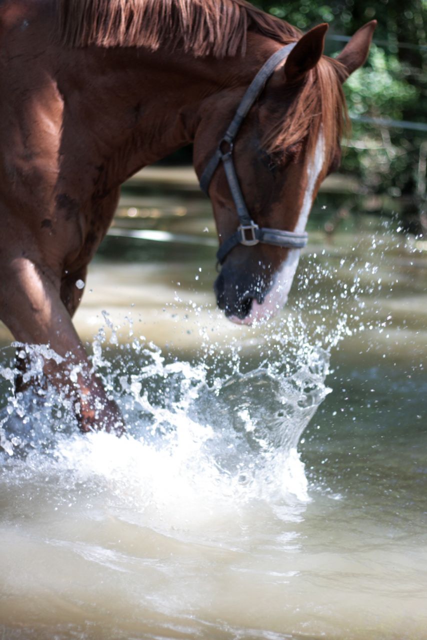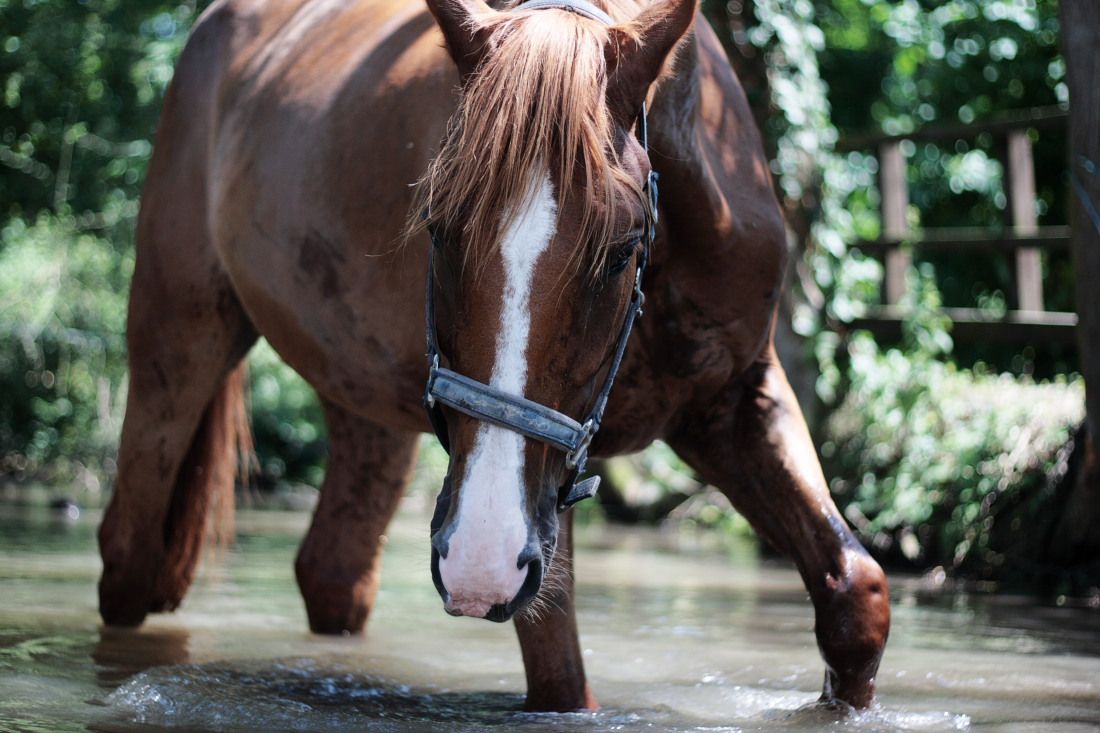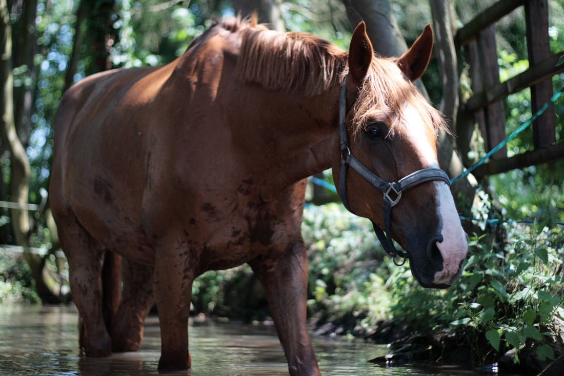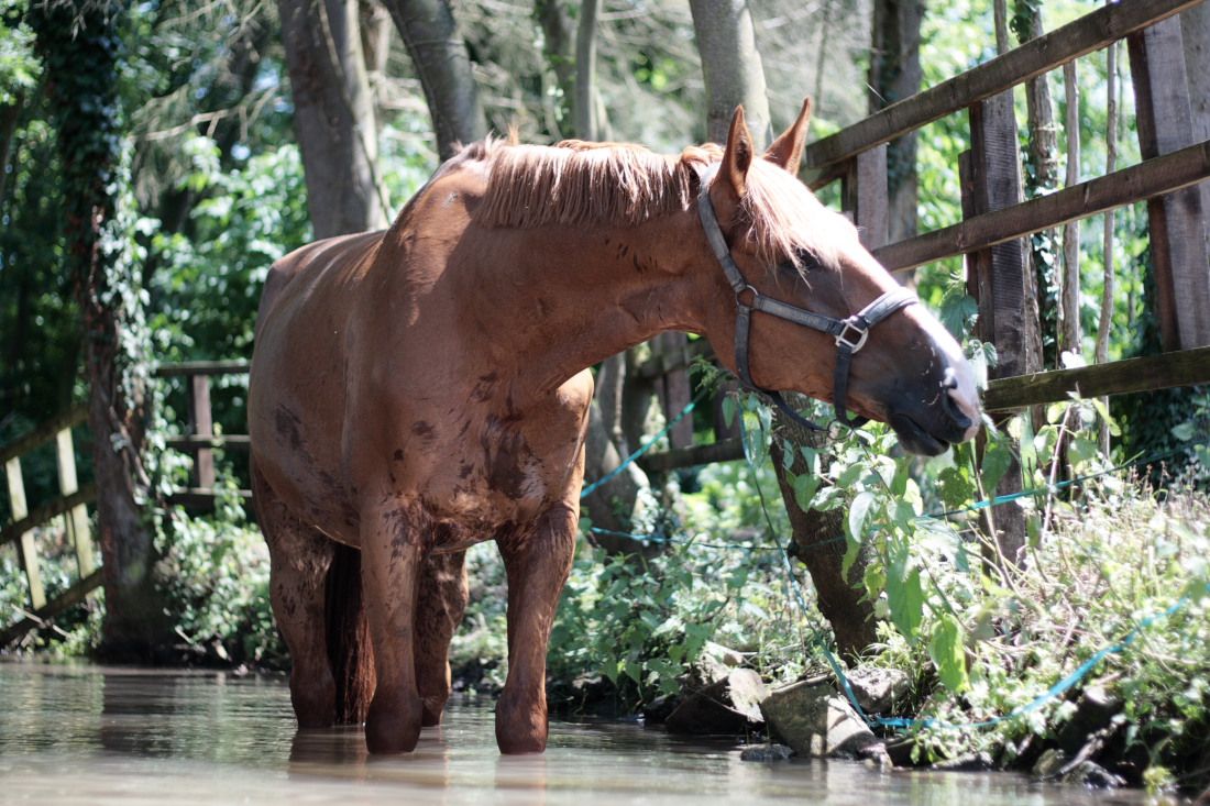 | Dire merci | Bon avec les chaleurs là le petit a glandé. ce matin j ai réussi à me lever et lui coller une petites longes à base de transitions pas - trot - pas. Pas de galop. ensuite je les ai foutu à l'herbe, enfin les paddocks et prés sont accessibles, parce que nous on a de sacrés soucis avec la flotte car les prés pour la plupart sont grave inondés... Hier par contre (et cet aprem aussi) les biais restent au box, et je crois que Syre a le box le plus chaud de l'écurie en hiver c'est top... et là c'est .. WAOUH quoi hier je suis arrivée, il avait la tête par terre, les yeux trempés, le poitrail trempé avec des gouttes qui coulaient sur les jambes, et pareil le dos et pareil le cul. bref on aurait dit que je l 'avait douché. du coup ce matin, on a trainé à la rivière un moment vers 13 h avant que je le rentre (devais partir réveillée à 6H30 pour etre de nuit ce soir va falloir que je dorme !!! ) et douche intégrale sans passer le couteau de chaleur. J'ai balancé une poubelle pleine de flotte dans le box pour mouiller le foin et laissé 'eau dedans en espérant u'il "joue" avec s'il a trop chaud.... du coup moi aussi je me suis baignée dans la rivière histoire de faire mes photos et du coup ca m'a bien refroidi le cul, c'était trop bien (oui je me suis accroupie dans l eau...) |