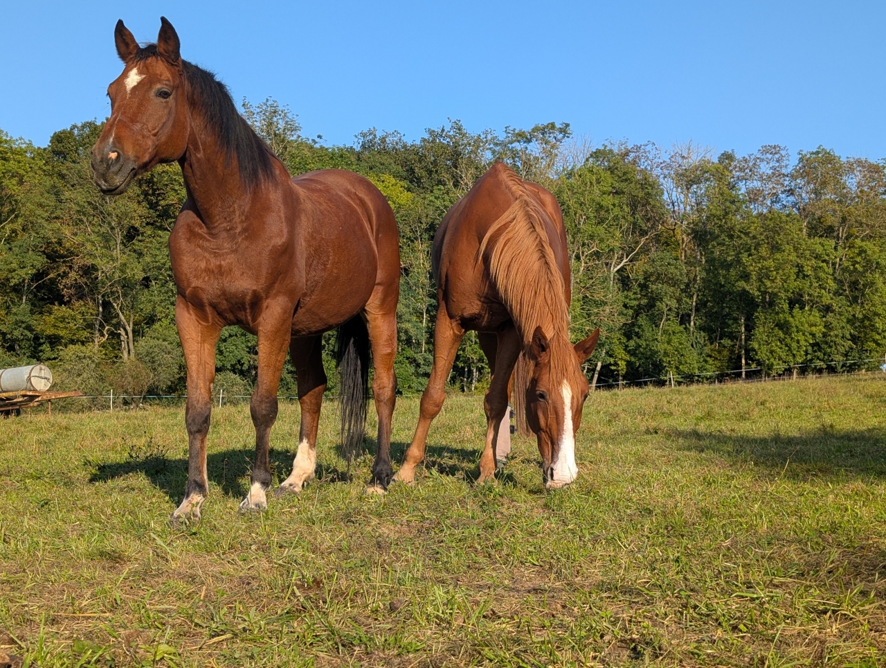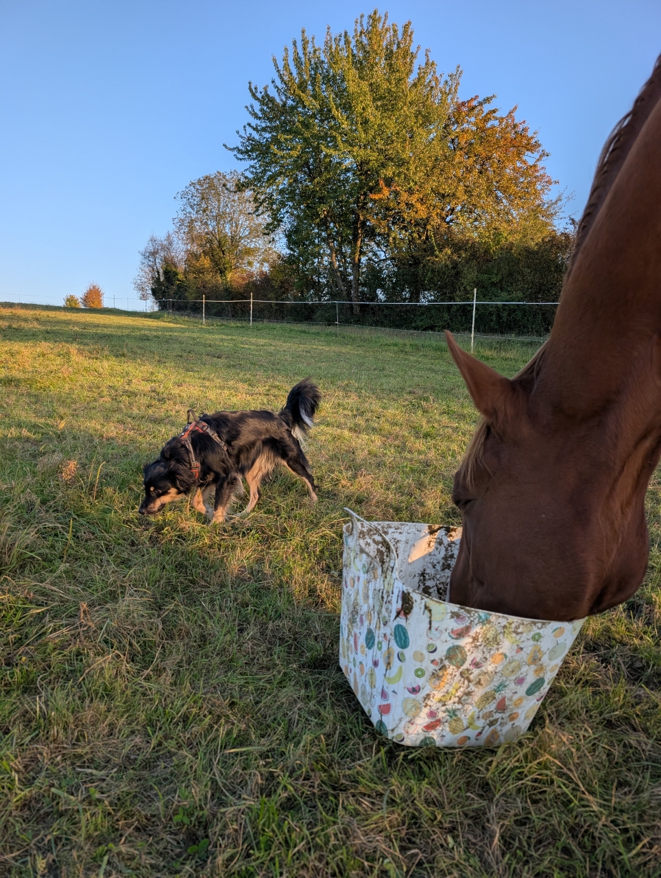 | Dire merci | AH je n'avais pas vu la dernière réponse. Papi est redevenu normal quand l'autre pensionnaire est partie .... il avait accepté que qqun vienne encore avec une pouliche et s'est rendu compte que ça n'iarit jamais et a donc dit non. Depuis tout est rentré dans l'ordre. On est de nouveau "seuls au monde". Au début ça me faisait peur, car plus trop d'aide.... Puis finalement je me suis rendue compte que j'aidais plus dans l'autre sens de toute façon. Donc je me suis centrée sur Syre et ses multiples emmerdes (avec sa photo sensib qui a flambée et on vient à peine d'en sortir .... ). Donc je suis "autonome à l'écurie, j'y vais 2x par jour globalement pour les rations et le foin (traité + enrubanné) et bien sûr surveiller les balezanes (protec sur les membres la journée en attendant la repousse correcte du poil etc). Il est pas très gros en ce moment, comme tous les printemps où il ne veut que de l'herbe et commence à bouder le reste. Au moins, pour le moment côté respi ça tient, il n'a pas tant pompé cet hiver. Avec le sec là, il tousse un peu plus mais je ne m'affole pas (pas encore). C'est pour "mon cerveau" que tout est compliqué cette année.... il a grillé un peu au fil de l'hiver. (rire jaune). |