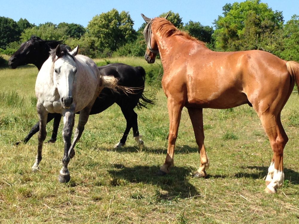 | Dire merci | Ahhhhh mardi matin le 3ème cheval arrivera dans le pré je pourrai commencer à sortir Syre seul ... Affaire à suivre. |