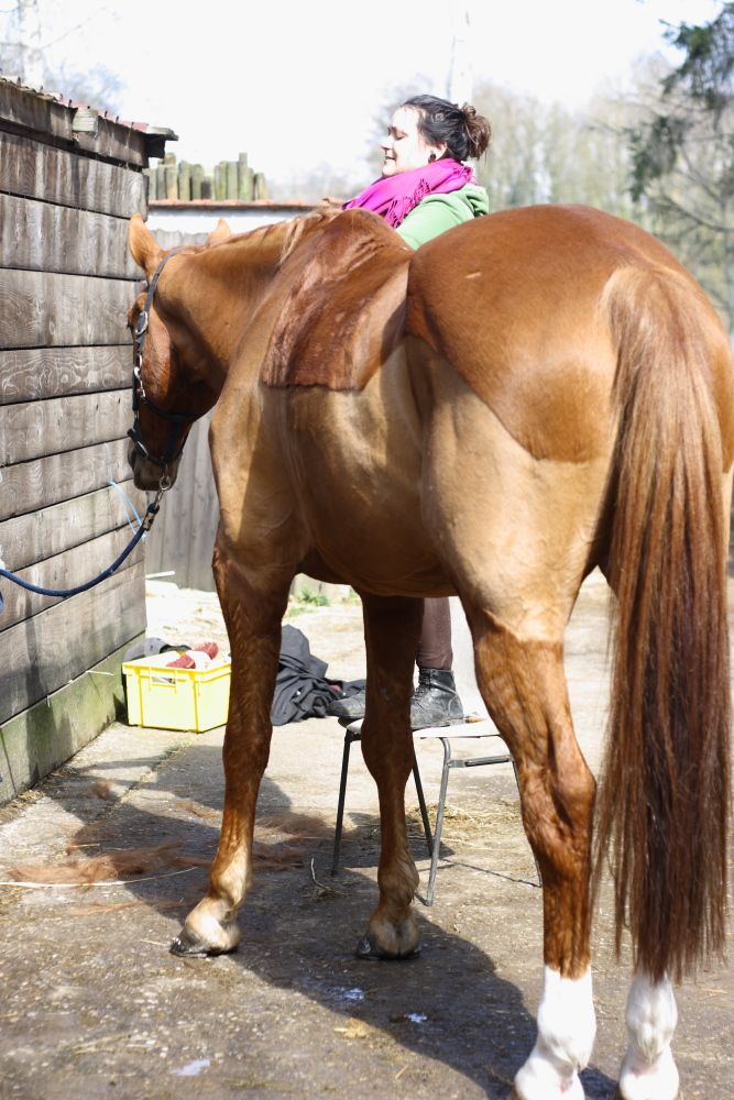 | Dire merci | oh ben merci ![]() DEs retours positifs ça fait plaisir un peu quand même dites donc ! ![]() Bon amoureusement je t'avouerais qu'effectivement côté mise en avant ça se passe mieux. Alors je ne suis toujours pas contente mais ça vient ! En même temps le jour où je serai satisfaite c'est pas demain. Mais bon, ça avance doucement et le fait de pouvoir bosser REGULIEREMENT sans devoir s'arrêter pour une op, une raideur ou je ne sais pas quoi au final ça aide je me demande si ce n'est pas la première fois depuis que je l'ai que je suis "tranquille" aussi longtemps !! Mais je devrais mieux de fermer ma gueule, je ne veux pas me porter la poisse. Bon ce matin, carrière, sous le soleil, on a eu CHAUD. On a détendu avec croquette à côté au pas puis on a bossé Des cavalettis trainaient, du coup hop. Avec des transitions etc etc etc. Un coup assise, un coup en équilibre. Bon ben moi quand je vois des barres, je pousse, en équilibre ou assise, c'est pareil je POUSSE. Ben vous savez quoi ... ??? TANT PIS. CA VIENDRA Après on est repartis avec croquette faire un tour dehors au pas, c'était bien cool. Puis je me suis occupée de ses canons pourris (ben non c'est toujours pas parti...... ) lavage et blanchissage de balzanes au savon noir (c'est un truc de malade comment c'est efficace) puis ma petit GOMII-GROOM (et officieusement, photographe, camerawoman, accompagnatrice et celle qui m'engueule de temps en temps -je le lui rend bien- et qui me supporte stoïquement quelque soit mes humeurs... ) a pointé le poney. Ben oui, faut bien qu'on essaie un jour de voir... et ça donne ça : Poney groomé par Gomii ... (pendant que j le brossais, lui "taillais" les postérieurs etc..) ![]() Parait qu'il fallait désépaissir un peu, Gomii elle fait ça OLD SCHOOL elle tiiiiiiire dessus (et le poney s'en fou ) ![]() ![]() la crevette ... ![]() le final ![]() ![]() |