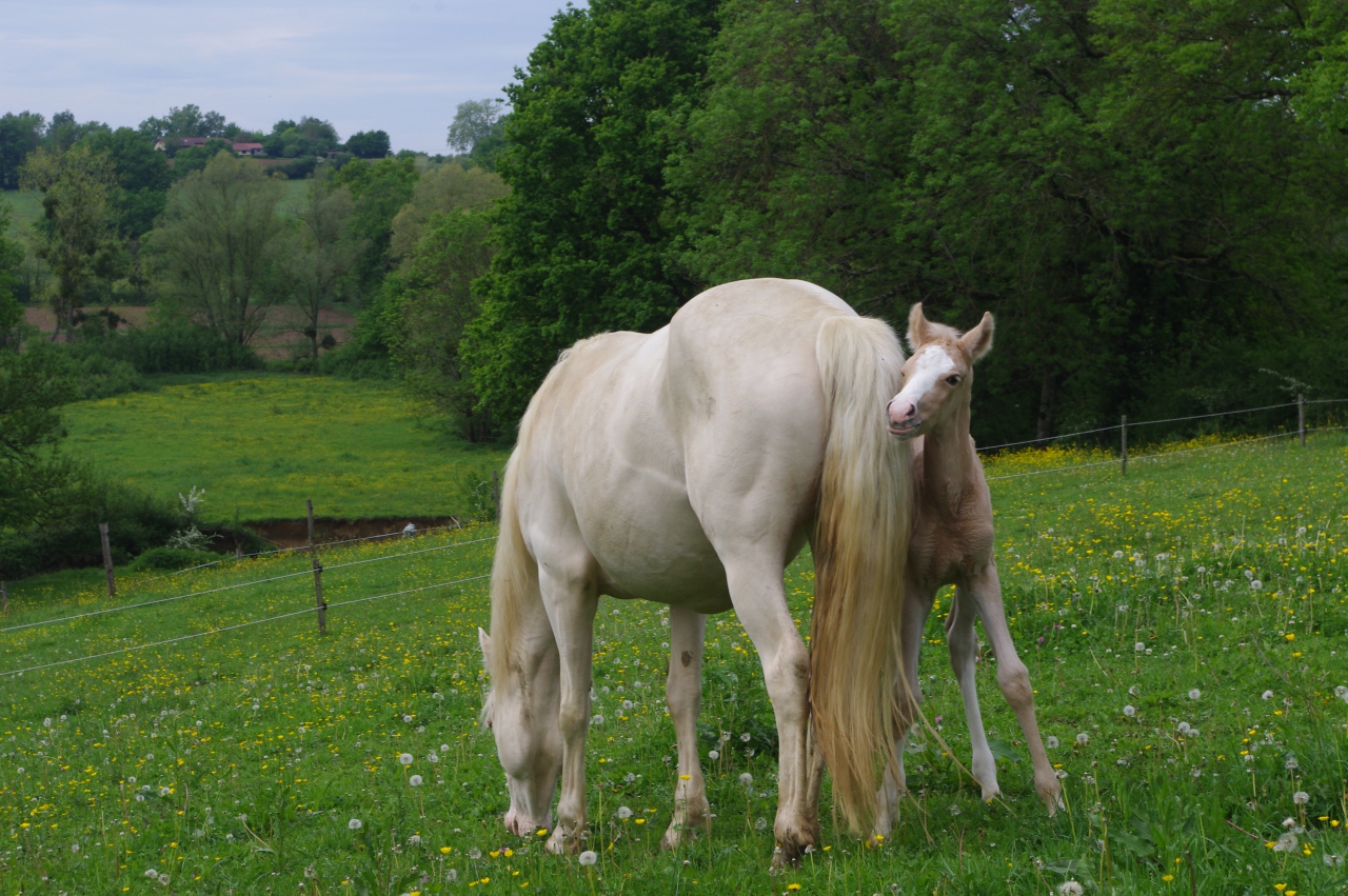 | Dire merci | merci mimine30 elle est encore un peu tordue postérieur gauche, je laisse passer qq jours et je verrai si je fais intervenir le véto ou pas ...Des photos de la poulette toute sèche: ![]() ![]() ![]() Elle a hérité du gène crade de maman ![]() et ma grosse Quitty en mode "supermaman" vraiment très gentille avec mon homme et moi, mais quand c'est quelqu'un qu'elle connait pas attention une copine du village est venue voir les pouliches ce midi, Quitty plaquait les oreilles et menaçait de la tête! Mira n'a jamais fait ça protectrice la Paint !Et finalement son ptit nom ça sera Fantasia ![]() |