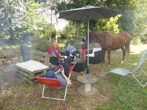 | Dire merci | J'ai pas mis beaucoup de nouvelles ici, mais on continue d'essayer d'être studieux avec Hasufel. ![]() On suit les conseils de Pili et on essaye de mettre un peu plus d'activité sur les séances de platouillage. Ca semble porter ses fruits, maintenant faut bosser. Et sinon, l'autre jour, barbecue en famille: ![]() Elle a passé 20 min "à table" à côté du salon de jardin à participer à la conversation. Honnêtement, si j'avais pas mis des chips à portée de naseaux et que j'ai préféré la remettre au pré, je pense qu'elle aurait pu rester là deux heures sans bouger, ravie de participer. Et avant, elle a aidé à allumer le feu pour les grillades. La tête dans la fumée, les flammes qui crépitent, rien à battre, ou si peu. C'est trop chouette de la voir comme ça. J'avais un peu cette inquiétude en la ramenant de Lannigou, où elle avait passé une douzaine d'année avec des chevaux tout autour, qu'elle soit tristoune avec seulement un seul copain de pré. Et non seulement ça lui va, mais surtout elle a l'air de vraiment kiffer la vie de cheval de famille. |