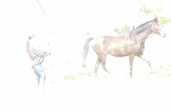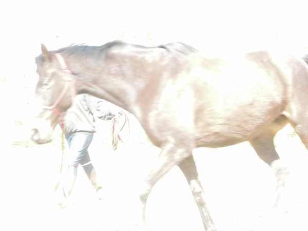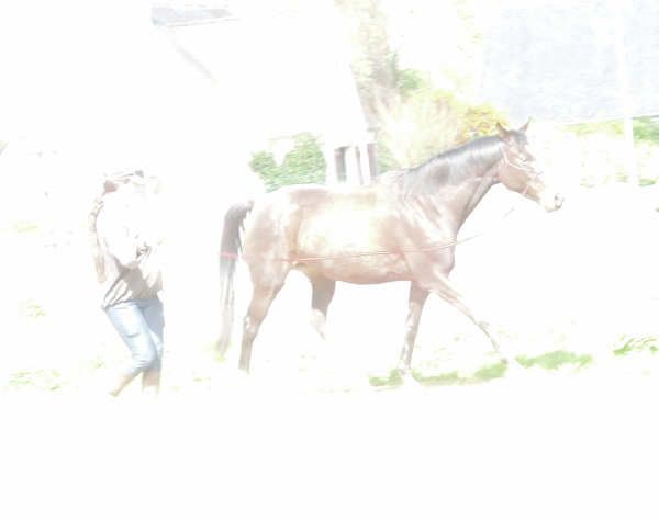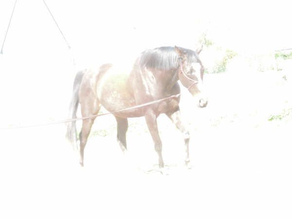 | Dire merci | Pourtant il se tape des galops au pré tous les jours, mais si je sors avec l'appareil photo, il vient me voir, donc c'est dur à immortaliser. Mais d'avoir rouvert le grand pré lui a fait du bien. Il s'est demusclé et l'accrochement de la rotule le gênait un peu. Rien que le fait qu'il joue à galoper dans le grand pré, et en une semaine, ça va déjà beaucoup mieux. |