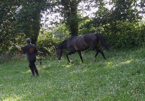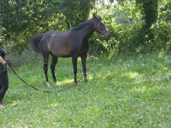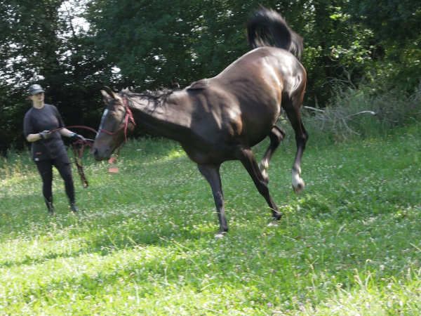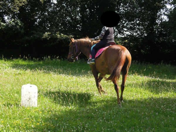 | Dire merci | Je vais me faire huer de râler sur la météo quand d'autres souffrent de la canicule... Mais j'étais un peu dègu d'avoir à monter avec pluie et vent aujourd'hui. Bon, pour Ode ce matin, je m'en foutais, mais pour Hasufel cet aprem, c'était relou (plus le vent que la pluie, surtout quand on longe un champ de maïs qui se met à bruisser à cause d'une bourrasque). Bon il est toujours bien gentil, mais ça lui a quand même un peu réveillé les fourmis dans les pattounes. Bref... c'est quand même un 5 ans avec un peu d'énergie à revendre. ![]() |