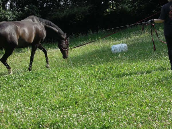 | Dire merci | Ce matin, on est retournés platouiller sur le pré communal. Bon, à part les mouches qui l'embêtent, il a été mignon. Un peu plan plan même, mais quand même à l'écoute, et puis c'était la reprise, je lui ai juste demandé d'être à l'écoute. On a fait des ronds et des transitions au pas et au trot, rien de compliqué, mais vu le peu qu'on sait faire, c'est bien assez. ![]() Et il a eu plein de câlins et de compliments au marché. ![]() (mais il n'a pas voulu de la feuille de salade de la maraîchère) |