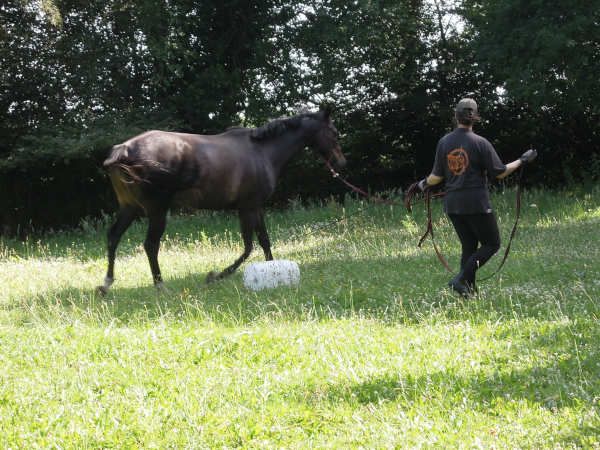 | Dire merci | Pimpin beaucoup moins premier de la classe hier à la longe. ![]() On a fait une séance avec M, pour poursuivre sa remise en selle avant son départ samedi chez ses grand-parents en région parisienne, où elle ira faire son stage la semaine prochaine (dans un club près de chez eux où elle est déjà allée, sur les conseils de micie et qui a effectivement l'air très chouette). On est allées dans le petit pré, là où on avait longé avec Sheyt et cicitt, sauf que cette fois l'herbe avait repoussé et que c'était quand même beaucoup moins pratique. Avec Ode ça allait encore, mais pour longer Hasufel, comment dire... Bref au programme, au pas, j'ai laissé la petit aux commandes cette fois, et on a travaillé sur le fait de diriger la jument en regardant bien où elle va, en s'aidant de bidons et de barres pour viser des trucs. Les jambes dépassent des quartiers, tout va bien. ![]() ![]() Petit virage ![]() Passage de barre ![]() Ensuite on a fait un peu de trot, en longe cette fois (d'où le licol laissé sous le filet). Bref la petite est à l'aise, prête pour son stage! Et ensuite un peu de longe avec Hasufel, mais ça a été du grand n'importe quoi. 1-Il ne pensait qu'à manger l'herbe haute 2-Il était harcelé par les taons ![]() Quelle belle extension d'encolure! ![]() Pas du tout, il cherchait à brouter. ![]() C'est la seule guignolade que M a réussi à photograpgier, et pourtant, il y en a eu! ![]() Mais assez vite j'ai pu lui demander des arrêts, donc il s'est quand même reconnecté à moi, mais il repartait en sucette assez vite. ![]() Bon il y avait des moments où il se posait quand même ![]() ![]() Moralité, le produit contre les insecte ça aide quand même pas mal, vu que d'habitude il n'est pas harcelé comme ça! |