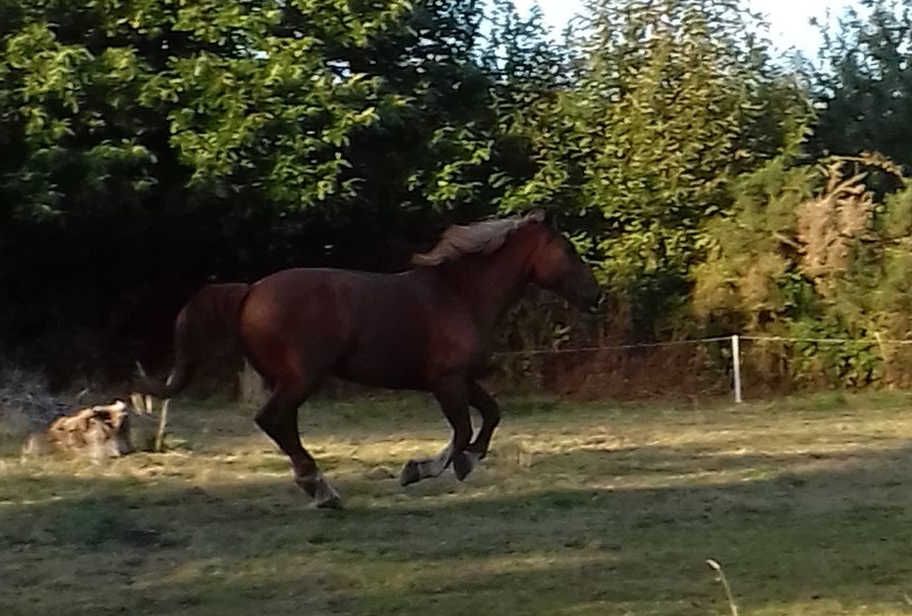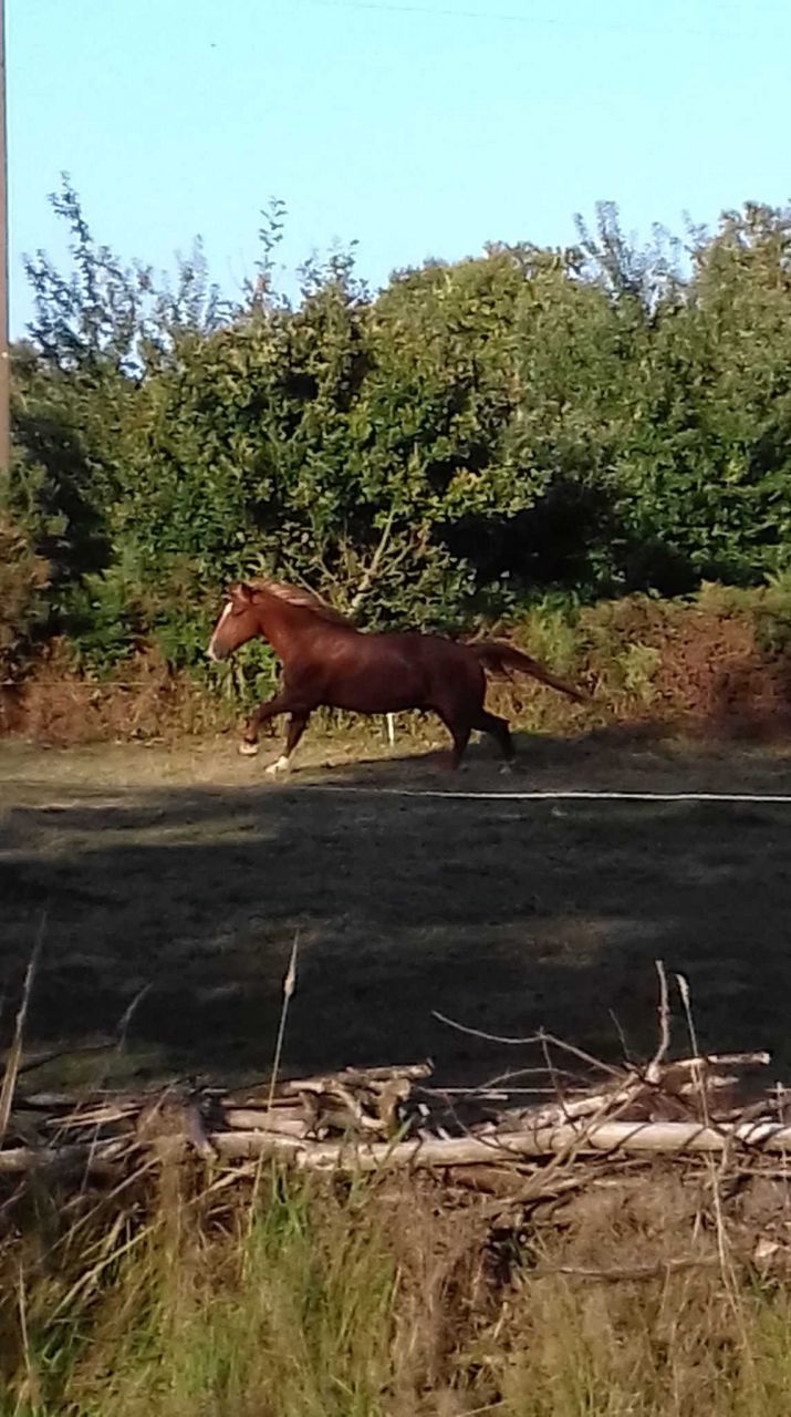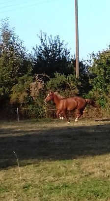 | Dire merci | Bon ben ça s'est super bien passé, Pierre qui attendait de pouvoir remonter à cheval depuis le début de l'été était ravi, et il a même pu monter Arouez sur le chemin du retour, donc il était super content. Et pendant ce temps là, à la maison, Sherpa galopait comme un neuneu dans son nouveau pré. |