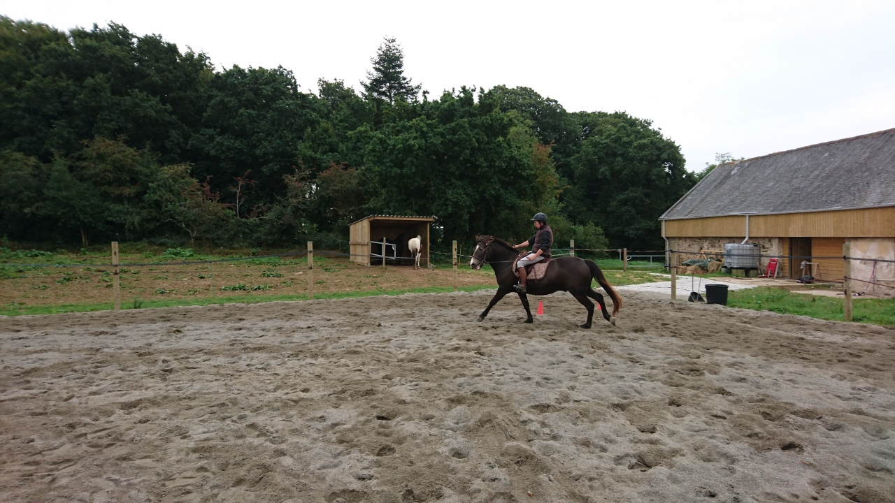 | Dire merci | Encore une chouette séance aujourd'hui. Je suis complètement impressionnée de la vitesse à laquelle il (on) progresse. C'est vrai que le cours particulier c'est top vraiment. Aujourd'hui on a travaillé les transitions dans l'allure ct vraiment sympa. Il est de plus en plus léger dans sa bouche et dynamique aux jambes. Je l'ai pas attaché donc pas de casse de licol. J'ai pris le parti de le mettre au paddock le temps de décharger mes affaires. Donc super séance. Encore un petit effort niveau poids ( pour tous les 2) et on aura tout ce qu'il faut pour avancer correctement. J'ai quelques photos de quand ma monitrice est montée dessus pour lui apprendre le galop ( et oui il connaît pas du tout le galop monté. Donc ni les aides de départs, ni rien du tout à cette allure en fait. Du coup c'est elle qui le le galope pour lui apprendre les bonnes bases. ![]() ![]() ![]() |