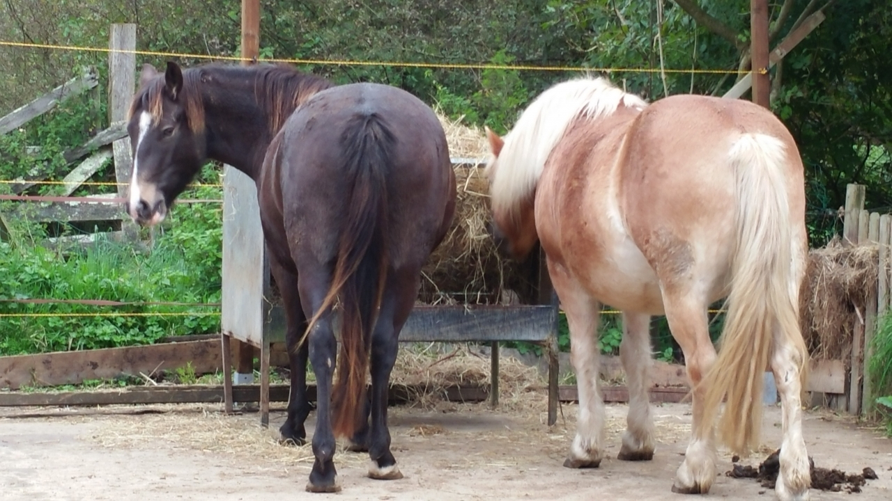 Déconnecté | Sinon pour la bouffe, Lulu étant trop gros aussi, je pense que rationner les deux, ça serait une bonne chose. Elle utilise des petites ou des grosses bottes de foin? Ils n'ont pas de grain? |