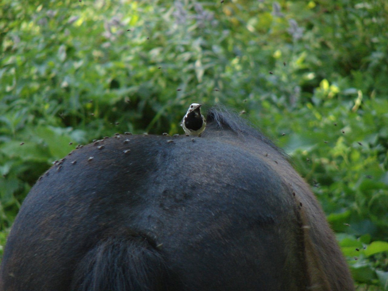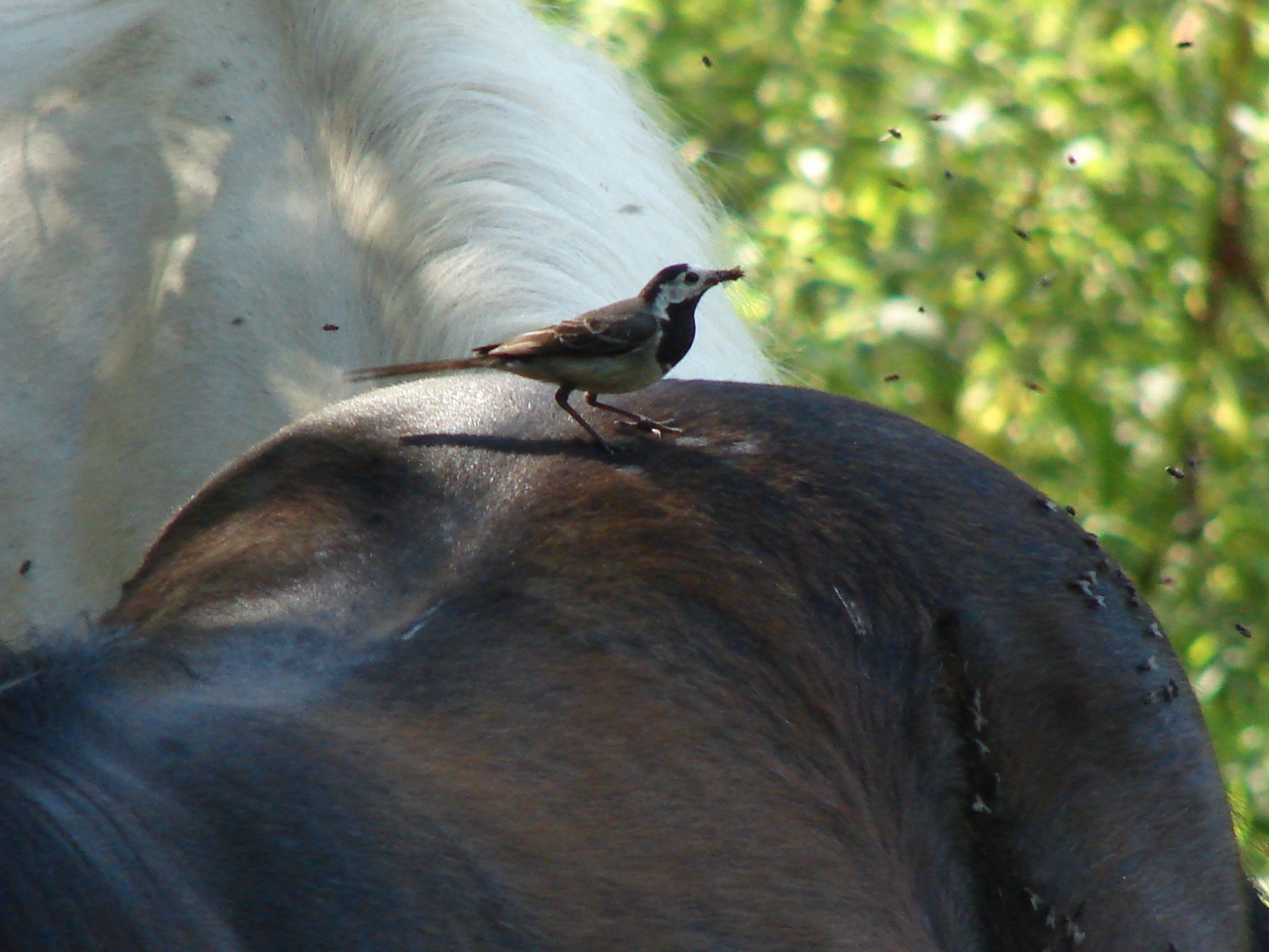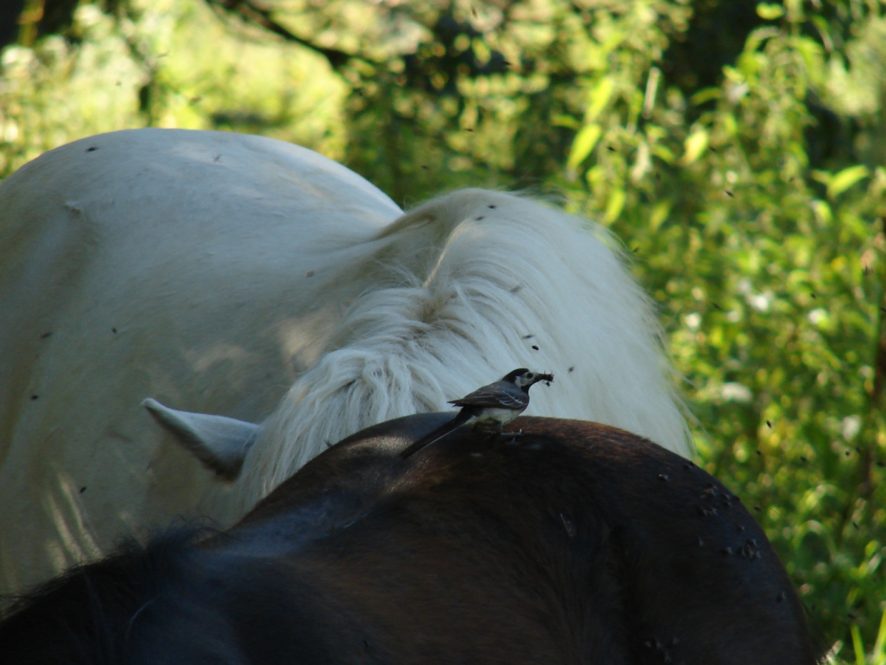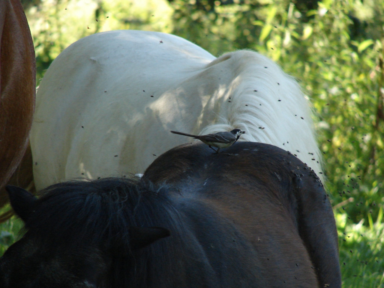 | Dire merci | à notre grand étonnement, une petite bergeronnette a décidé de prendre le gros poney pour un terrain de chasse ... difficile à prendre en photo, mais le petit volatile passe de la croupe au bas de l'encolure avec aisance, le poon s'en fiche royalement, ne bronche absolument pas... je connaissais les pique bœufs sur les camargues, mais pas la bergeronnette sur le haflinger !![]() ![]() ![]() |
