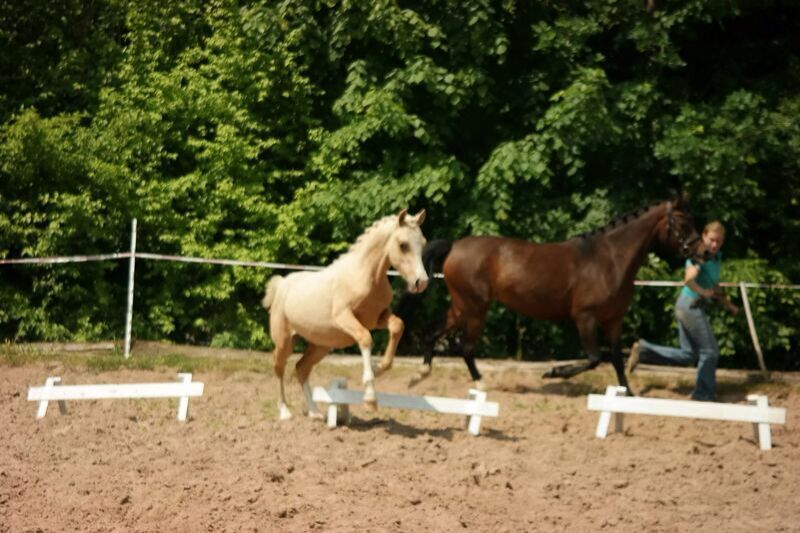 | Dire merci | Bon ça fait un bail que je n'ai pas remonté le post, en partie la flemme, puis le manque de photos/vidéos, puis pas grand chose de neuf en faite, un hiver pas terrible avec les terrains dégeulasses, les chevaux les pieds dans la boue, mes selles qui n'allaient plus, bref on a pas fait grand chose ! Deux petites photos faites début mai Mon super Joc qui a bien progressé en légèreté et réponses aux aides, qu'on peut maintenant se faire un peu plaisir en cordelette, premier cheval avec qui j'ose me lancer ![]() Ulkhan qui prend 8 ans cette année, sa selle lui reva à nouveau, donc bientôt en selle pour rebosser ce qu'on avait déjà travailler l'été dernier ! Mais à pied c'est toujours un régal ![]() Et comme le dit mon nouveau titre, un petit G va me rejoindre le 16 juin, j'ai craqué et ce sera mon premier cheval à moi sur les papiers, je vais évidemment continuer à m'occuper de Ulkhan et Joc mais j'aurais aussi de quoi m'occuper avec le mien Alors je vous présente mon petit poulain palomino, de race Deutsches Reitpony, pour ceux qui ne connaissent pas, c'est le poney français de selle des allemands. Depuis l'année dernière je regardais les annonces, je me suis pas mal documenté sur les courants de sang, origines, performances, caractères, et au final j'ai craqué sur sa bouille... Son papa a été sacré champion d'allemagne des 3 ans l'année dernière, Movie Star ![]() Spoiler