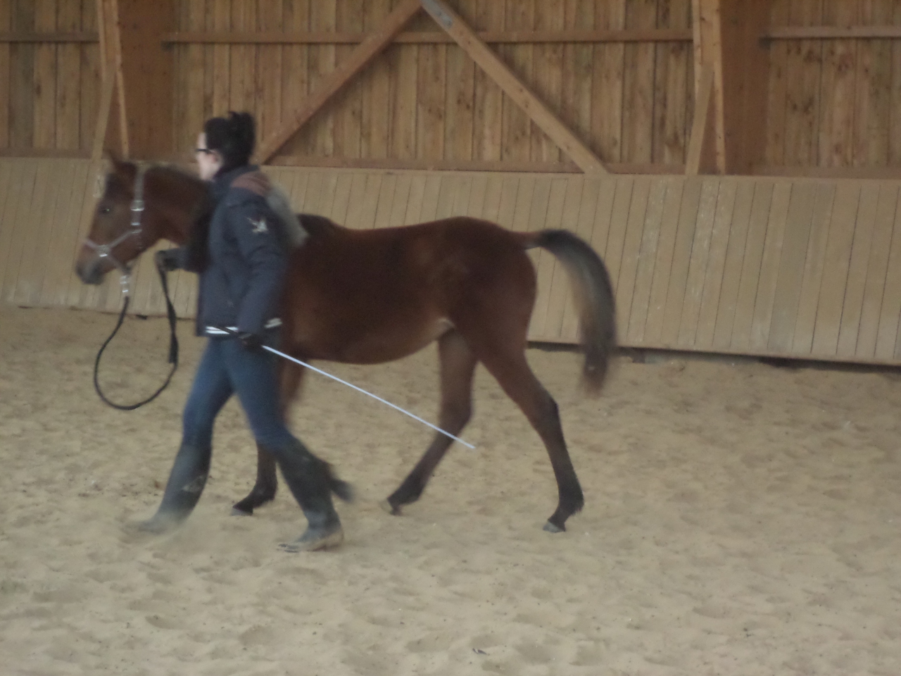 | Dire merci | Aujourd'hui petite visite vers pitchounette, au programme : grattouille au pré, prise des pieds (tenue au licol car sinon mission quasi-impossible pour le moment) Tout en restant au pré pour ne pas associer ma visite à la sortie du pré... Alors maintenant à chaque visite j'ai droit au hennissement ![]() Mise du licol sans aucun problème dès mon arrivée, Puis prise des antérieurs sans bouger et enfin le commencement de la prise des postérieurs : je commence du côté où elle est plus à l'aise, poulichette accepte la main partout jusqu'en bas, je lui demande de lever, elle lève rapidement puis repose. Alors plein de grattouilles en récompense puis vient le 2ème côté : je pose la main sur la cuisse puis descend doucement tant qu'elle ne bouge pas, j'arrive au jarret et elle se met à tourner, alors je garde la main sur le jarret jusqu'à ce qu'elle s'arrête, mais au contraire ça l'énerve et elle eût tenté de me latter... Donc après une engueulade relativisée, je recommence et la caresse jusqu'au pied sans lui demandé de lever. Et on s'arrête avec des récompenses Je lui enlève le licol et je me disque finalement elle est calme et vraiment "avec moi" aujourd'hui, donc pourquoi pas tenter la prise des antérieurs en liberté... et là, la mission "quasi impossible" est devenue tout à fait réalisable puisque poulichette a donné les 2 antérieurs sans bouger d'un poil Et enfin, après 45 min de grattouilles voilà la fin de ma visite ... Et qui me suis alors que je traverse tout le pré dans la boue? Poulichette! (Elle qui était presque inattrapable il y a encore 3 petites semaines) et ce jusqu'à la porte du pré en poussant ses copains qui étaient sur son chemin entre elle est moi... Finalement je n'ai pu résister à la sortir et aller la faire brouter l'herbe bien verte de l'autre côté de la pension... pendant ... 1h! ![]() Et avec sa queue blonde : ![]() |