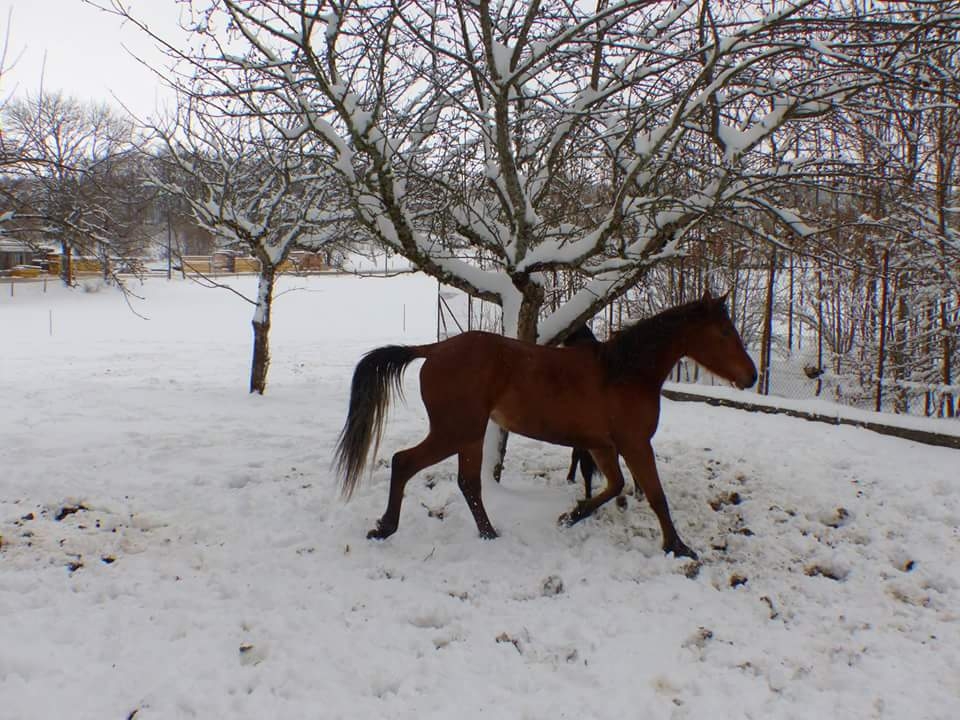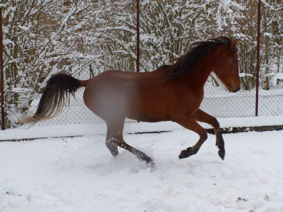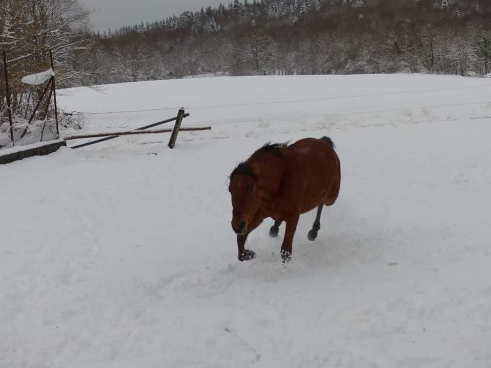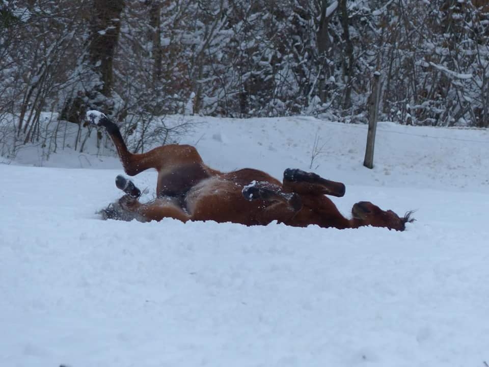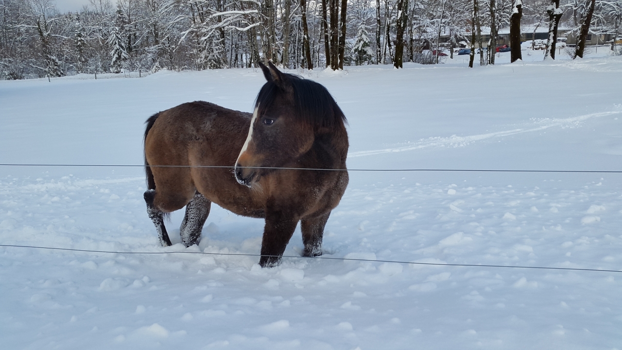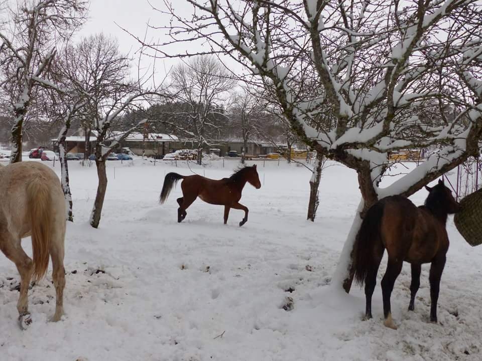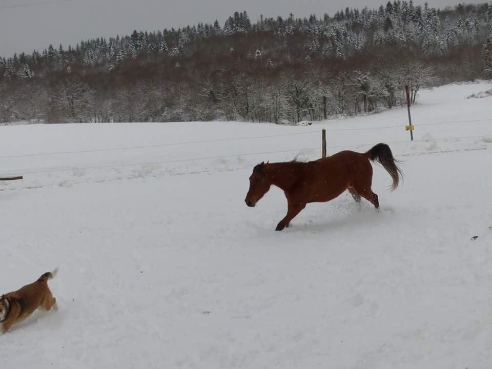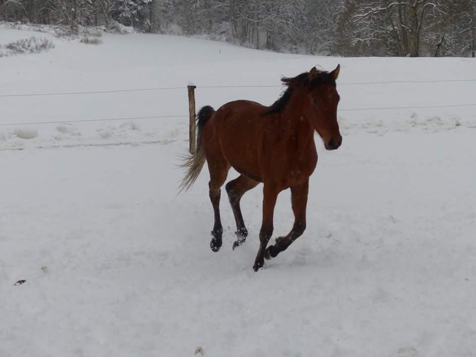 | Dire merci | meuh si qu'elle peut galoper Naska, j'ai des photos ^^ et si je peux me permettre, ce matin à la sortie du box, Isis s'est une fois de plus jetée dans la neige ^^ ![]() |