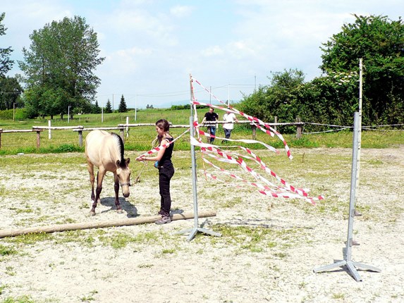 | Dire merci | Comme promis, les photos du petit stage de dimanche ! On était que 3 « poulains », Eséis était la plus jeune (les 2 autres avaient 2-3 ans) Globalement, la miss était bien excitée / stressée, mais elle a bien passé tous les "obstacles" (sauf 1), en fait elle a surtout fait l’imbécile entre les obstacles, quand elle devait attendre… ![]() La présentation "du modèle" ![]() Là, elle devait juste marcher autour des quilles, pour les allures… mais les quilles ça l’intriguait pas mal ![]() ![]() Reculer entre les barres, ça elle maîtrise nickel ! Faut dire qu’on l’a déjà un peu "travaillé" à la maison ![]() ![]() Bouh le parapluie Petite réaction, mais rien de bien méchant ! Pour la "surprise sonore" (une bouteille remplie de gravier), zéro réaction par contre ! ![]() Petit saut ! ![]() Elle a l’air sage en photo, hein ? ![]() ![]() ![]() Là on voit pas très bien, mais entre les blocs il y avait des tapis pour voiture, fallait marcher dessus… no problem ! ![]() ![]() Là, le seul truc qu’elle a pas passé… les banderoles ![]() Elle est bien passé à côté, mais pas dessous, à travailler à la maison ! ![]() ![]() Une bâche avec des bouteilles en plastique dessus… ![]() ![]() ![]() ![]() ![]() ![]() ![]() Et voilà ! Bilan : une aprèm riche en émotions pour un bébé… 1h de van, débarquer dans un endroit nouveau, plein de chevaux inconnus de partout autour, on lui demande de rester concentrée… La journée entière aux QL, ça doit être sacrément éprouvant pour les jeunes ! Une pouliche très volontaire sur les exercices (elle a tout passé assez facilement, sauf les banderoles mais on a pas insisté plus que ça, faudra le bosser à la maison), mais qui se laisse un peu emporter par son excitation par moments (petites ruades en main ) même si elle reste respectueuse de sa longe, elle tire un peu mais n’embarque pas…Et puis de stress, elle en a refusé toutes les récompenses (carottes) que j'avais préparé pour lui donner pendant les exos alors qu'à la maison elle adore ça...On va essayer de multiplier les sorties en tous genre pour qu’elle apprenne à gérer ça au mieux ! |
