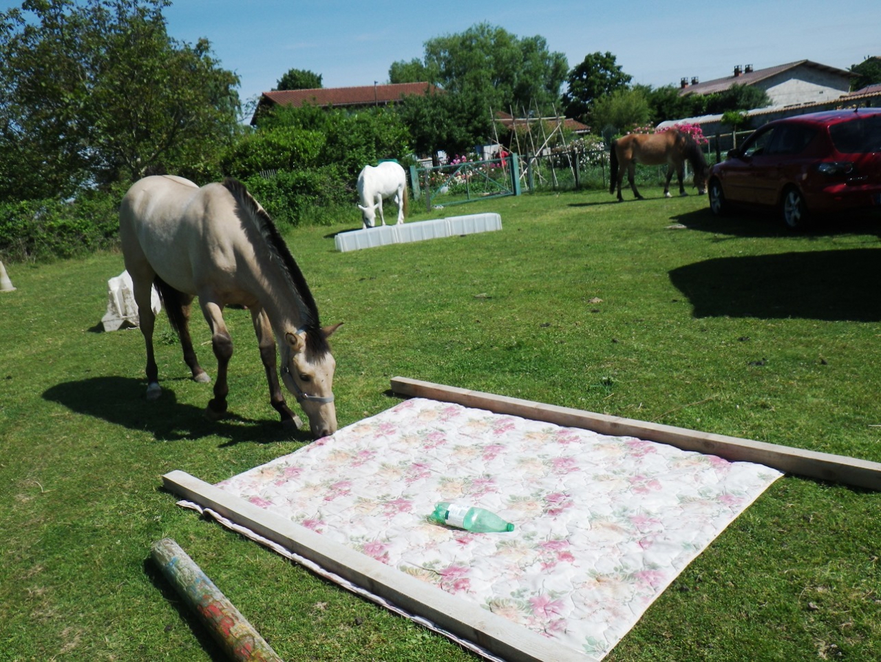 | Dire merci | bloody01 Ah oui ça me rassure pas pour les banderoles on en a acheté un rouleau, je pense qu'on va en accrocher un peu partout ![]() Par contre Eséis je pense qu'elle a plus un tempérament de "meneuse" que de "suiveuse"... apparemment c'était déjà comme ça chez syrius avec les autres poulains, et je le vois ici aussi, suivre bêtement c'est pas son truc, elle préfère partir à l'aventure, et les autres suivent "selon moi si tu la fais bouger sans arrêt, elle ne va pas apprendre à rester dans le calme" Oui c'est ce que je me dis aussi ! En théorie du moins Samedi matin on a installé dans le pré plein de bazar-à-torturer-les-poneys, et les 4 y sont passés du coup... bâche plastique, couverture à fleurs, portique avec ficelles et bouteilles pendues, matelas (elle l'a défoncé à grands coups de sabots et de dents), petit obstacle, plots de chantier en plastique, et van. Ma sœur a fait plein de photos et vidéos, je chargerai ça ce soir Elle a bien tout passé, le plus "difficile" a été le portique et le matelas ! pourtant quand on l'a mis, c'était la première à aller voir/mordiller/gratter dessus... mais qu'on la "force" à passer dessus c'était une autre histoire En gros seule, elle avait les 2 antérieurs dessus, mais en longe elle sautait par dessus... mais elle a fini par passer ![]() |