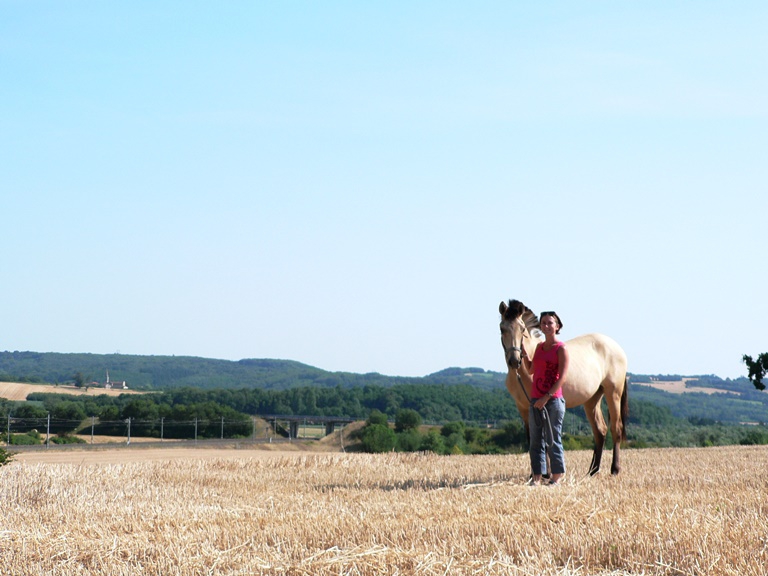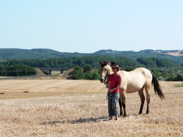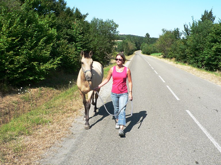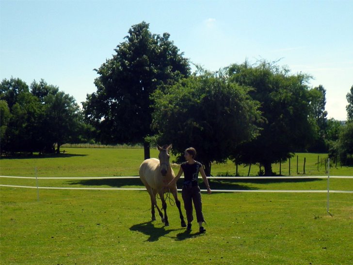 | Dire merci | elle est belle Chouette cette sortie ! C'est normal qu'elle soit stressée, ça fait beaucoup d'un coup tout ça. C'est plus facile de faire une étape intermédiaire : - travail d'exercices nouveaux dans un lieu connu - travail d'exercices connus dans un lieu nouveau Et seulement ensuite : - travail d'exercices nouveaux dans un lieu nouveau ![]() Tu peux également emmener un cheval qu'elle connait. ça lui servira de référent le temps que tu deviennes toi même le référent ![]() Le but c'est que les sorties ne soient pas source de stress, sinon le bénéfice est limité. il faudra aussi perfectionner à ton positionnement : ![]() Sur cette photo par exemple la pouliche n'est pas du tout à sa place, elle est devant toi, et ne te regarde pas. Pour être son référent, il faut qu'elle soit derrière toi, les épaules toujours sous ton contrôle. C'est comme ça que tu auras son respect et son attention... et sa confiance ! ![]() En tout cas, je ne me fais aucun souci pour son débourrage, déjà parce que vous avez du TEMPS ! ![]() et pour sa criniere, ça va pousser, faut surtout pas couper ! |