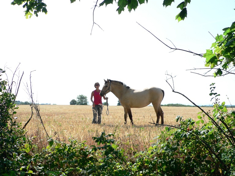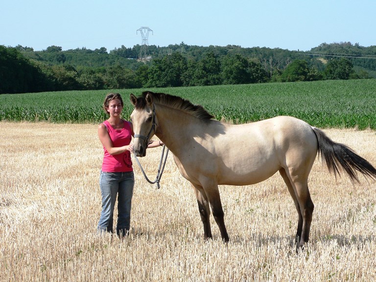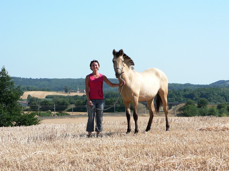 | Dire merci | Oui nos vécus se ressemblent bien, sauf que pour ma part ma jument est plutôt "pas facile" de caractère, je pense (et j'espère +++ ) qu'Eséis sera bien plus facile à travailler, même si elle a quand même un petit carafon bien présent déjà Mais on la sent volontaire et réfléchie, ce qui n'est pas toujours le cas de Jasmine pour le côté "réfléchi" (elle va d'abord ruer dans les brancard, puis réfléchir, puis passer finalement partout... ) |