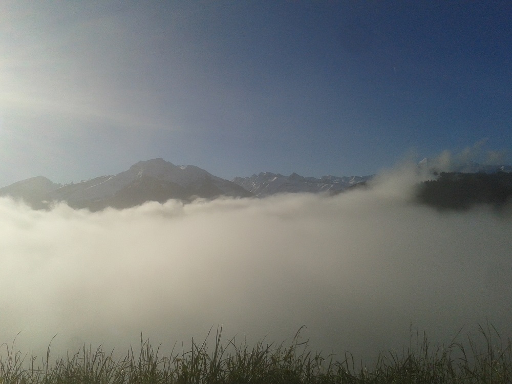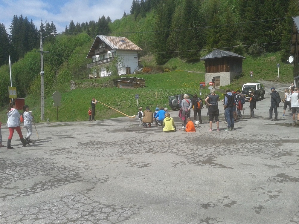 | Dire merci | Après on arrive à une autre pause ! On est à 10 min à pieds de l'alpage où elles vont passer l'été. Mais ce coup-ci c'est la vrai pause : les vaches sont parqués et tout le monde prend bien son temps. Moi je descends de cheval et on marche ![]() Après s'être bien désaltéré l'agriculteur et un ami à lui nous joue un petit air de cor des alpes ![]() |