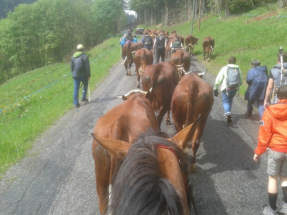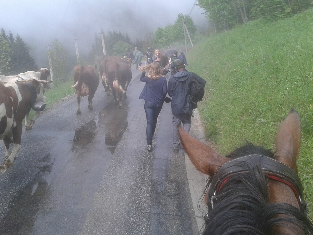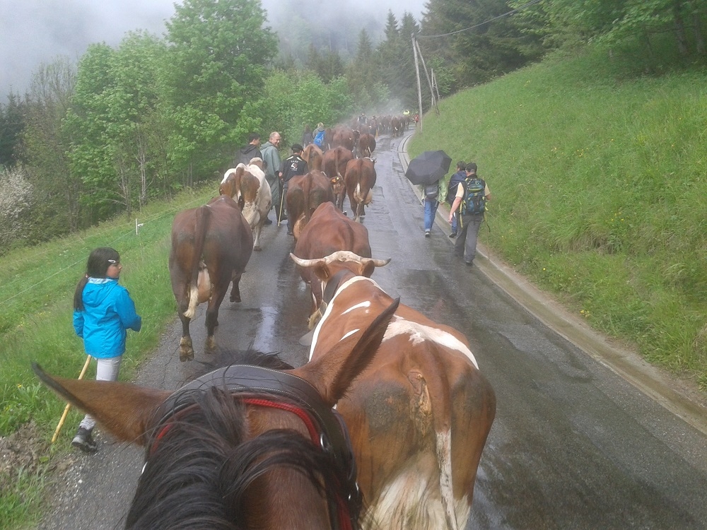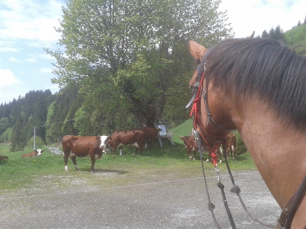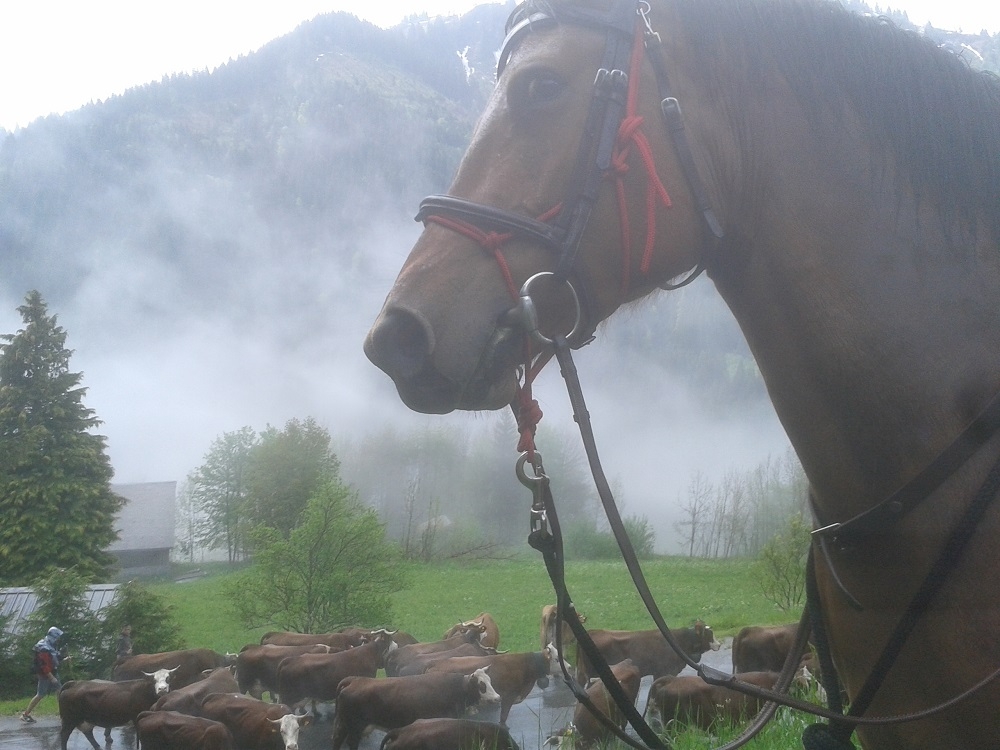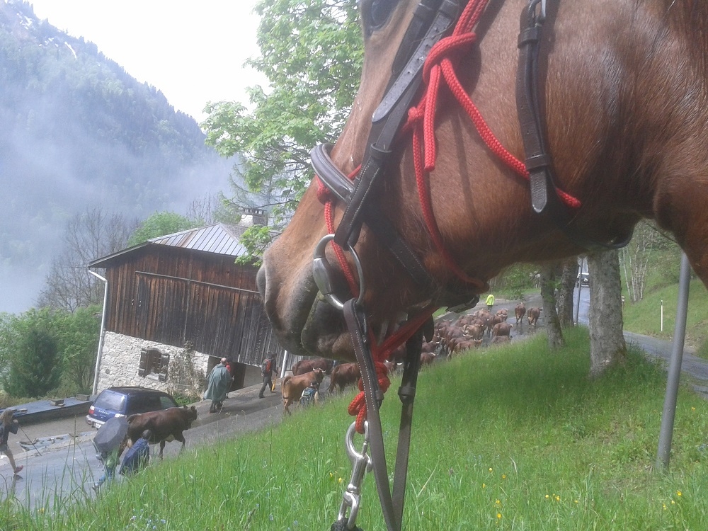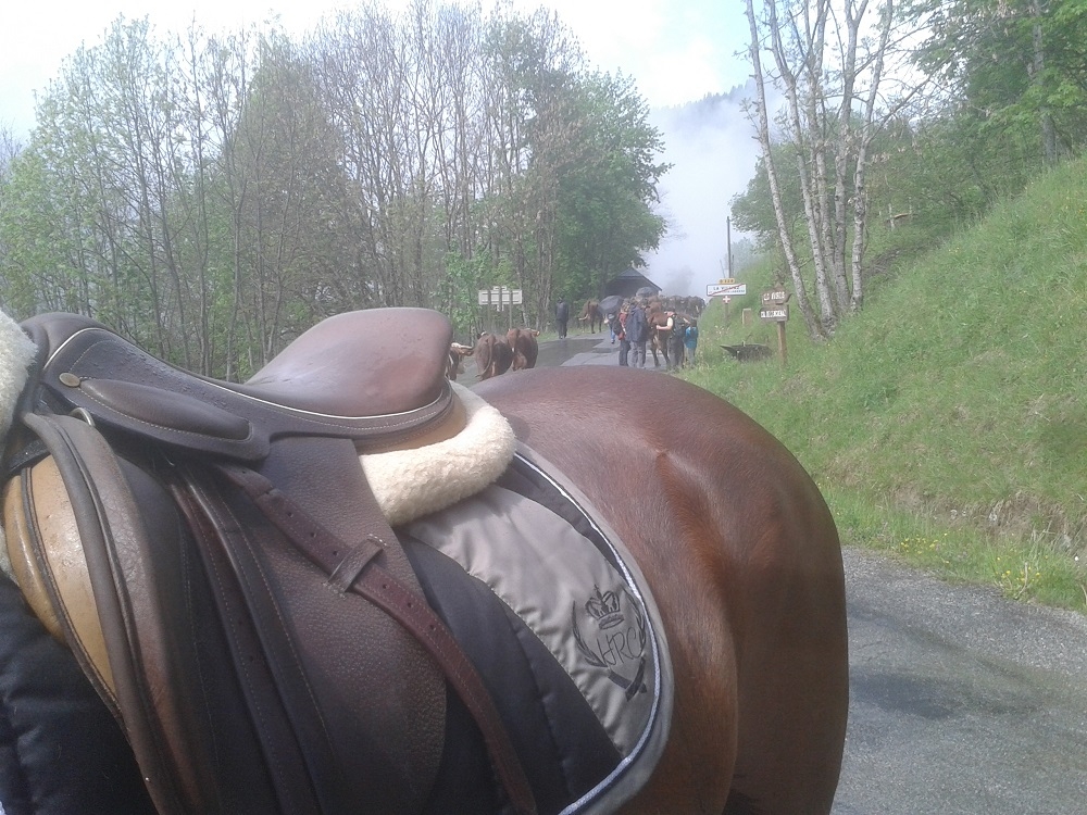 | Dire merci | Donc samedi dernier, il y avait l'emmontagnée des vaches qui passait près de la maison. Je m'étais dis que ce serait de les rejoindre à cheval. Et puis comme ça Daïka ne serait pas seule pour se promener Et ça fait un top entrainement parce qu'elles ont toutes les cloches, qu'il y a beaucoup de personne que se joignent à cette journée qui est une vraie fête dans nos petits villages ! |