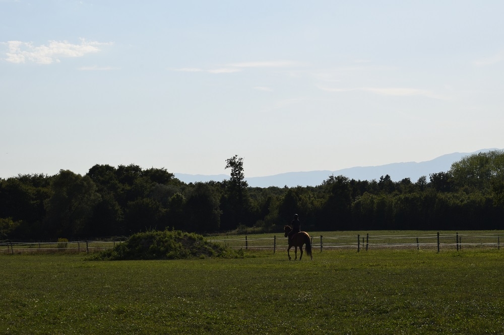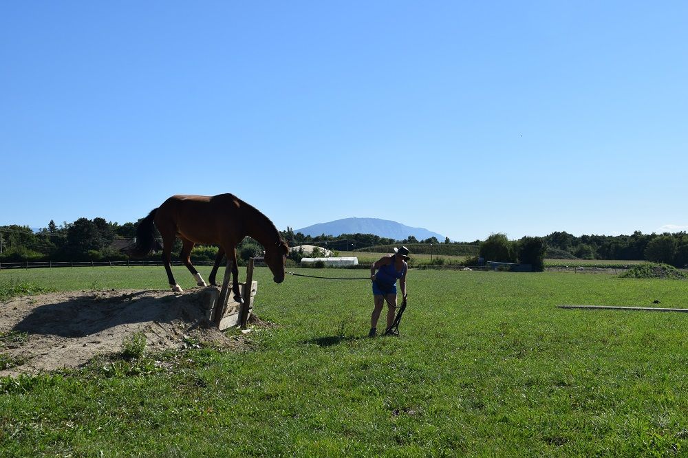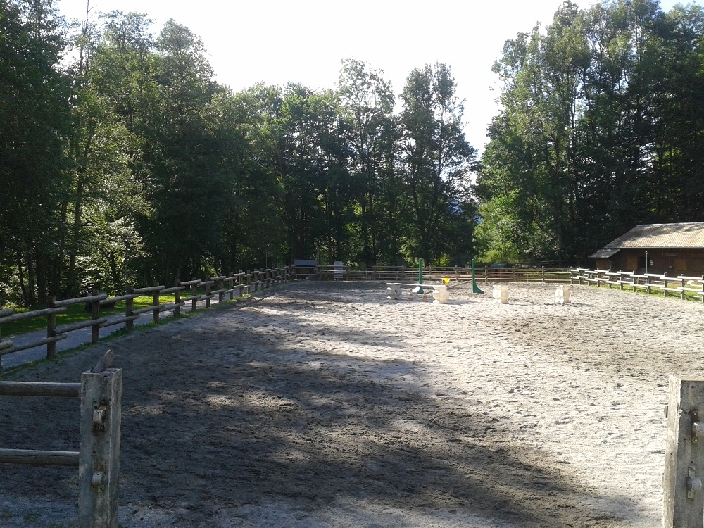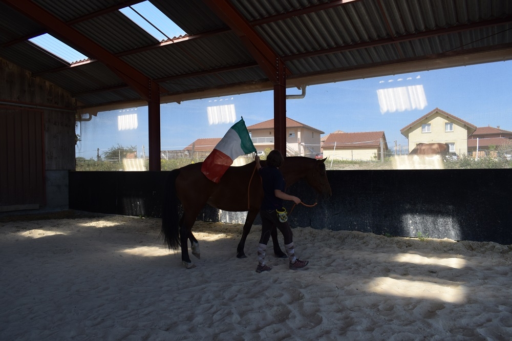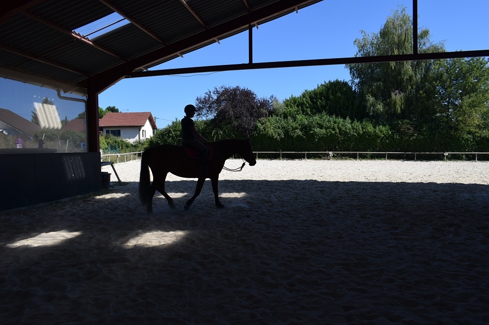 | Dire merci | La semaine suivante on avait un cours de plat. Après avoir détendu le prof nous fait mettre sur le cercle à l’entrée de la carrière. Une fois sur le cercle on travaille le rétrécissement et l’agrandissement du cercle. Daïka était bien au travail : c’était notre 5ème séance dans ce centre et ce coup-ci elle n’avait plus rien à faire de ce qui se passait autour. Il faut dire qu’un pré longe un grand côté et un petit côté de la carrière et qu’il y avait un cheval qui regardait tout ce qui se passait dans la carrière avec la tête par-dessus les barrières ; ça n’aide pas vraiment à la concentration. De plus le centre est mis en gérance par la commune et est situé au début d’un parc où tout plein de monde vient se promener : gens avec enfants, chiens, vélos, … et le chemin passe de l’autre côté de la carrière. Donc ça brasse beaucoup de monde mais là Daïka était super dans le travail ! |
