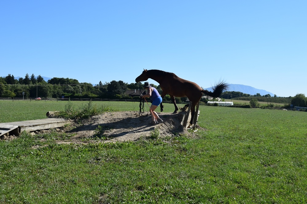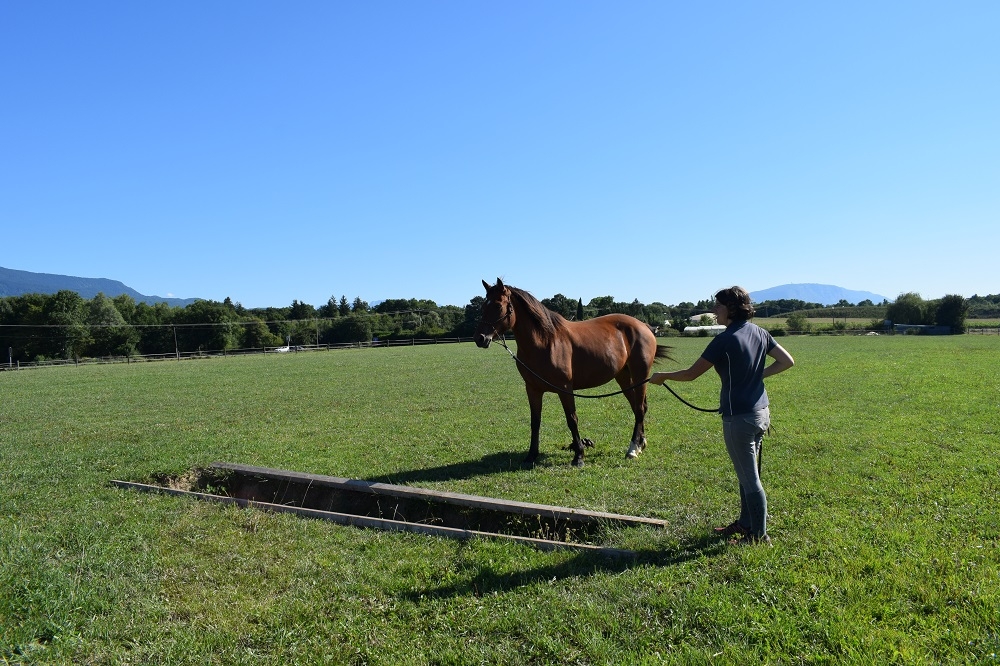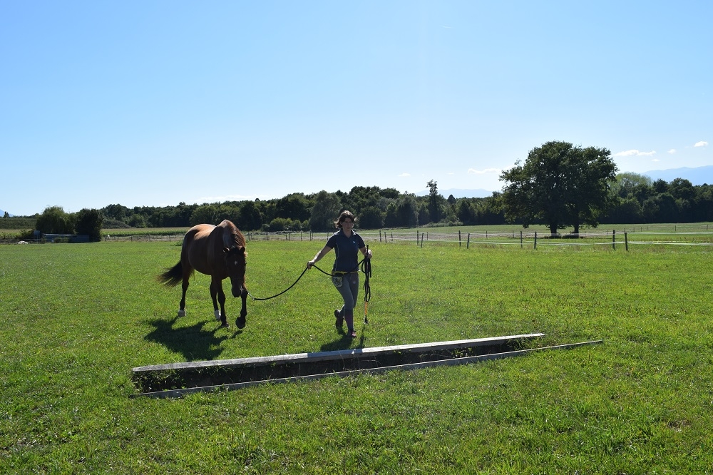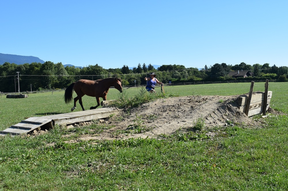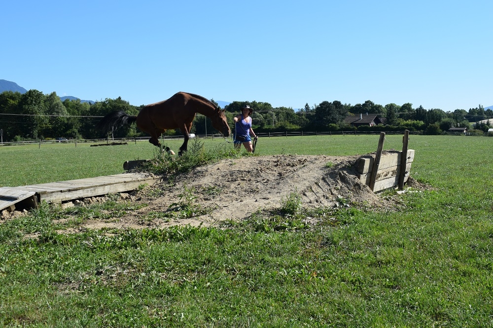 | Dire merci | Ensuite on va sur la doline qui est à l'autre bout du pré :![]() ![]() Puis le moment le plus compliqué du stage pour Daïka : le fossé mangeur de poney ![]() ![]() Après un crottin et quelques négociations : ![]() Forcément on refait : ![]() Puis petit contre-bas et contre-haut : ![]() Puis graand (du moins pour moi ) contre-haut et contre bas. Je laisse la bête à la prof ![]() ![]() Et le postérieur gauche qu'elle laisse trainer lui vaudra juste un bon arrachage de poil![]() |