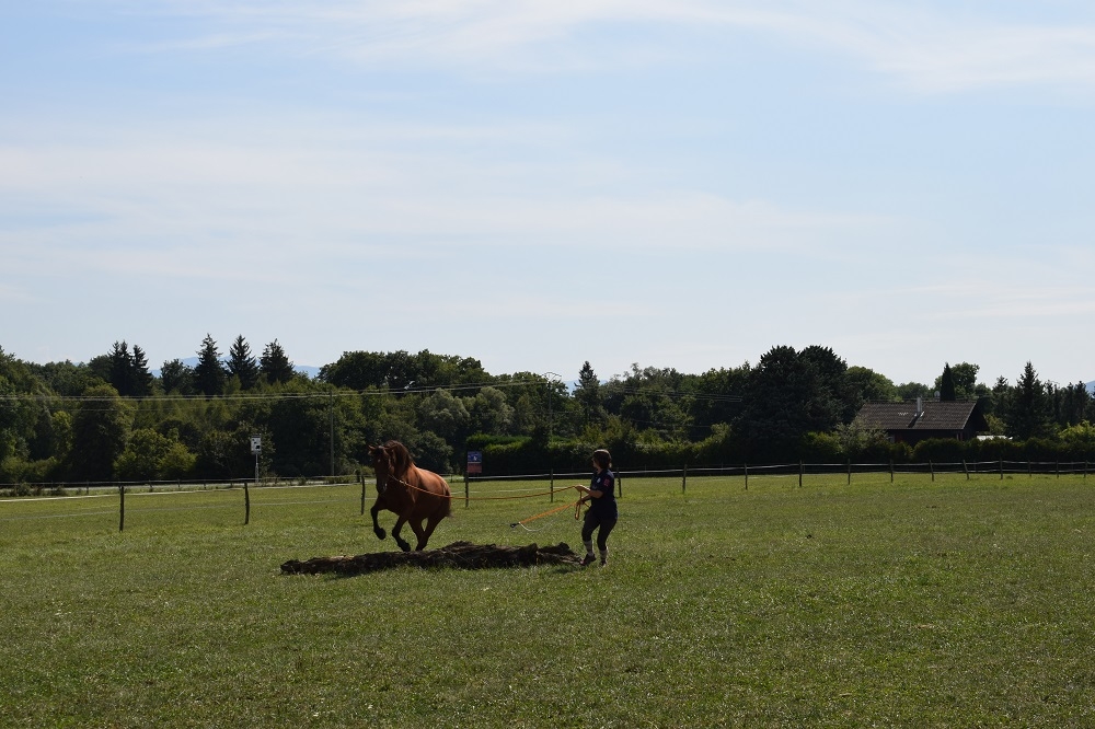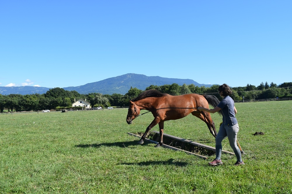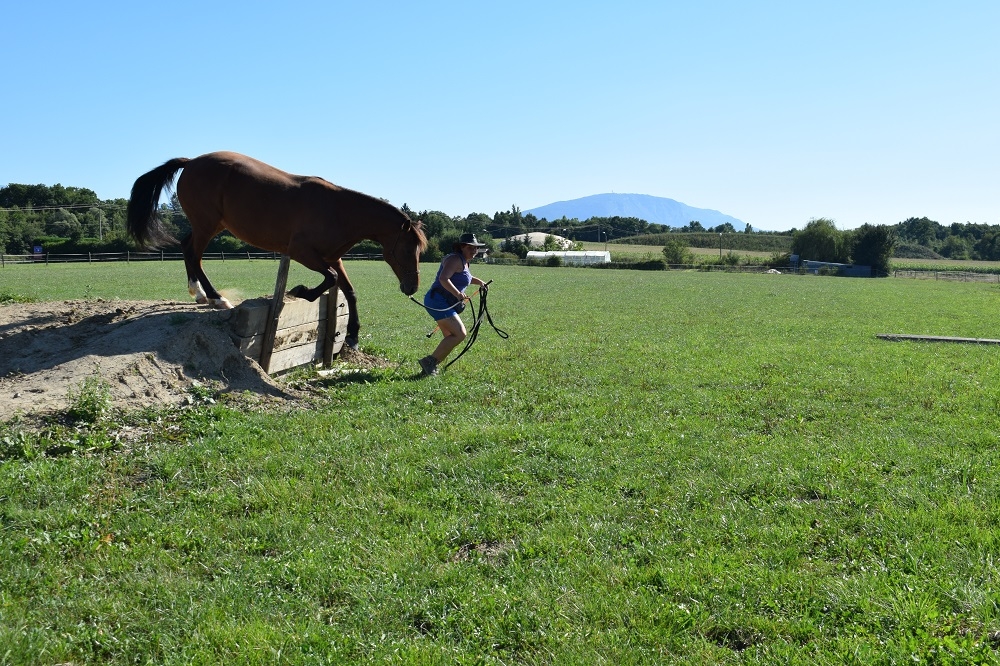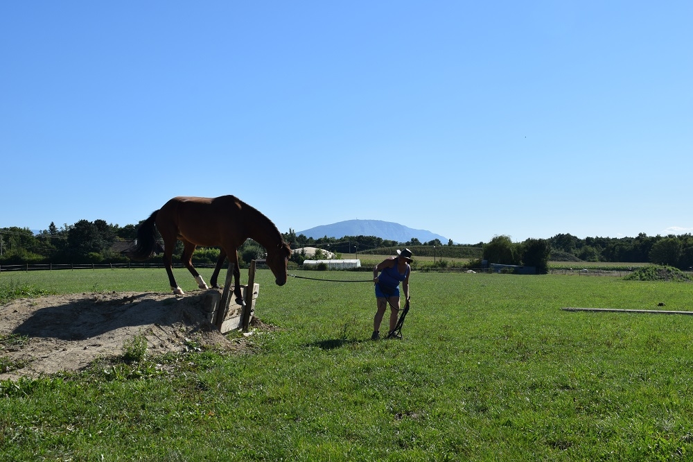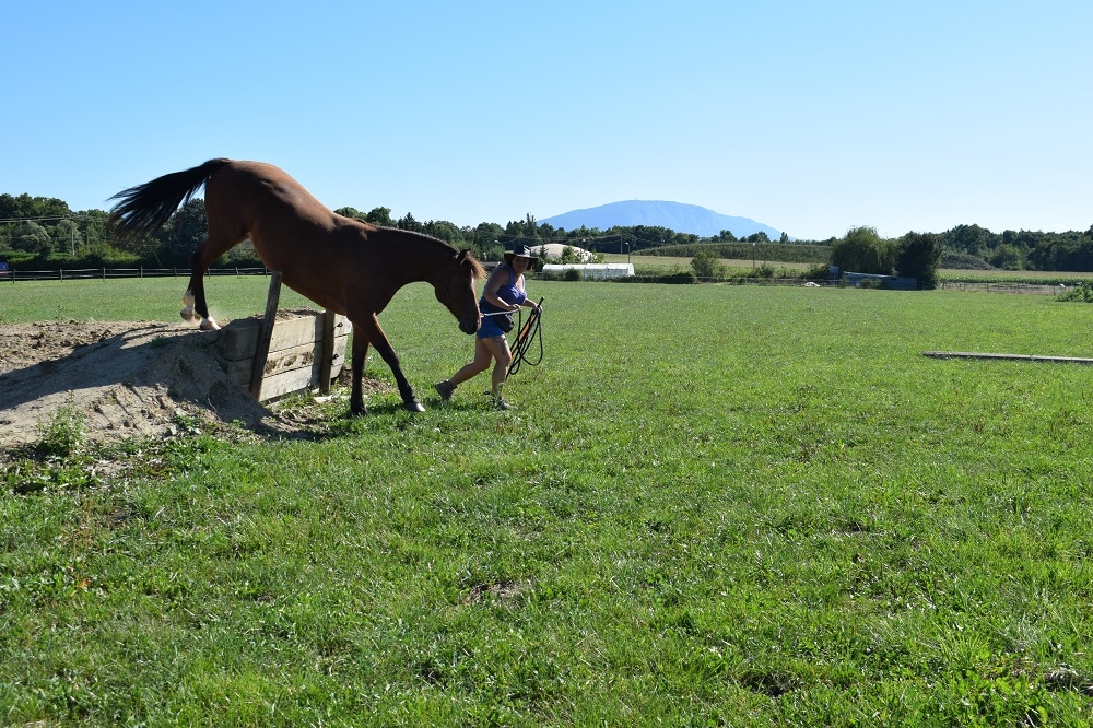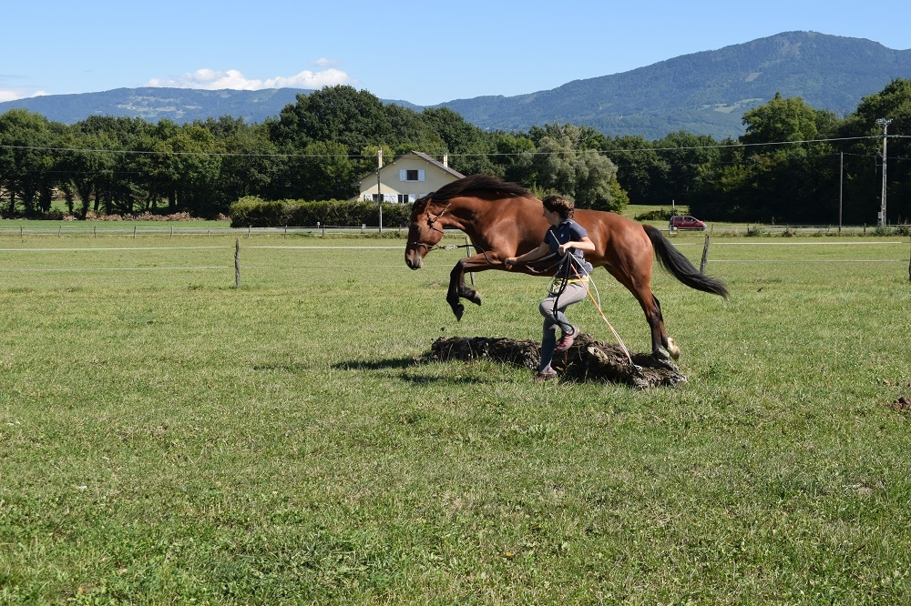 | Dire merci | Ensuite on va sur la doline qui est à l'autre bout du pré :![]() ![]() Puis le moment le plus compliqué du stage pour Daïka : le fossé mangeur de poney ![]() ![]() Après un crottin et quelques négociations : ![]() Forcément on refait : ![]() Puis petit contre-bas et contre-haut : ![]() Puis graand (du moins pour moi ) contre-haut et contre bas. Je laisse la bête à la prof ![]() ![]() Et le postérieur gauche qu'elle laisse trainer lui vaudra juste un bon arrachage de poil![]() |
