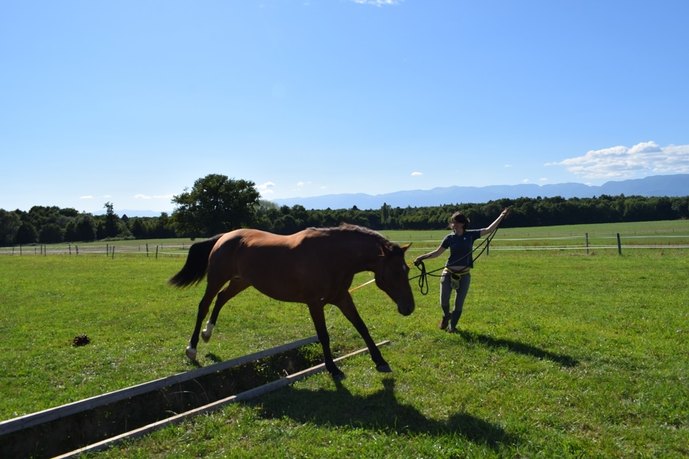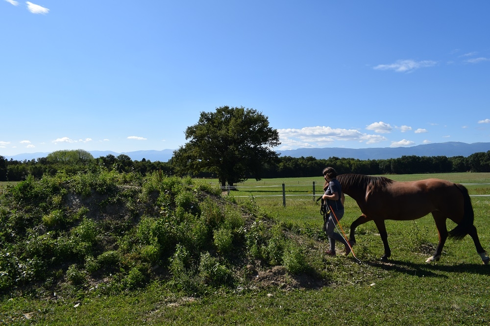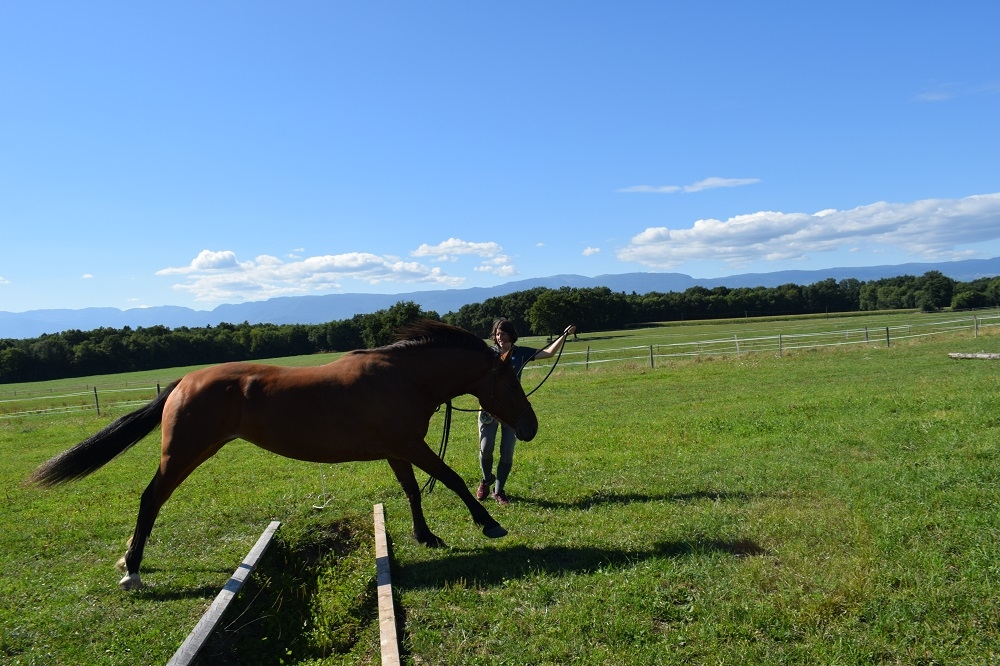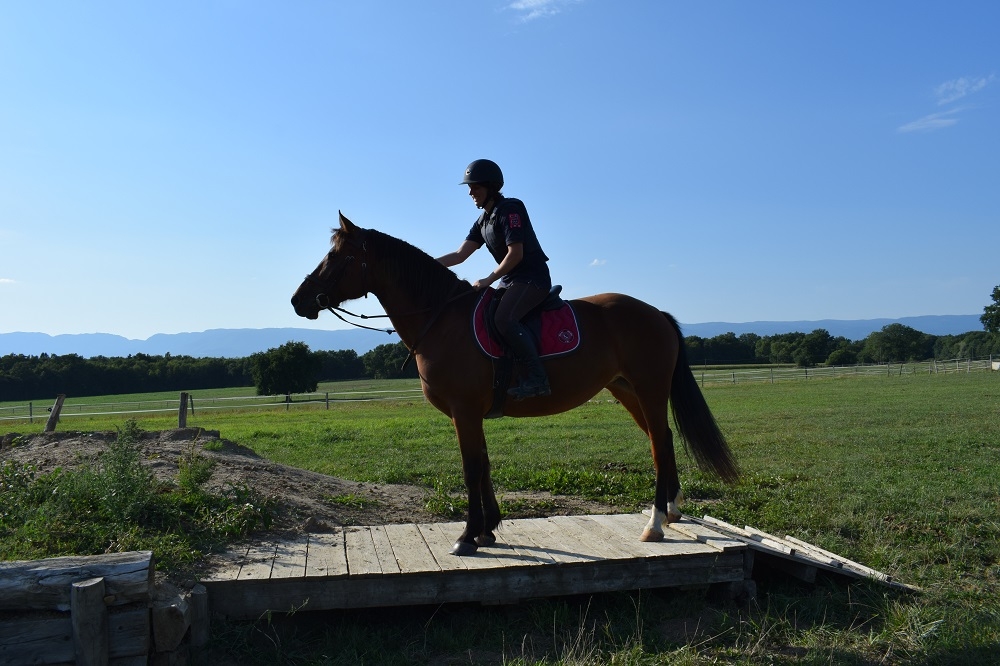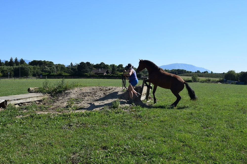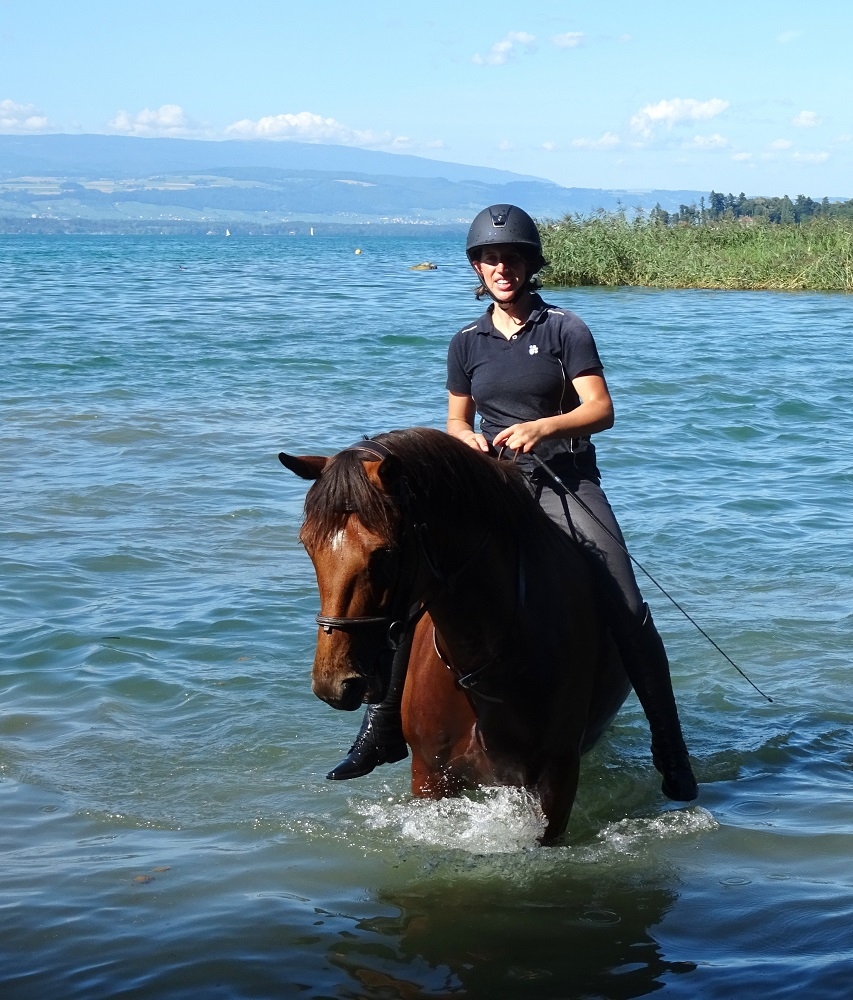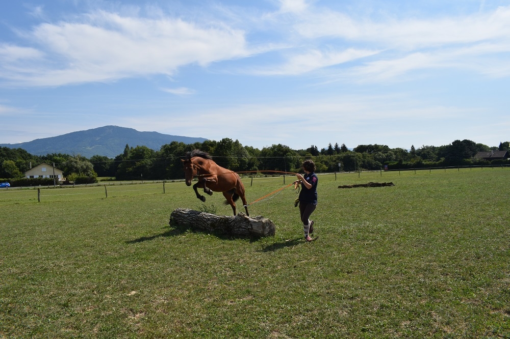 | Dire merci | Mardi, on bosse à nouveau dans la carrière (ou plutôt dans le manège parce qu'il faisait une chaleur pas possible ).On reprend toute les étapes du débourrage : faire marcher en pas à pas en demandant le levé des pieds avec la longe, désensibilisation notamment au tapis, déplacement des hanches juste en posant les doigts à la place que serait la jambes si on lui demandais, de même pour le déplacement des épaules. Elle est ultra légère c'est un régal ... bon la mienne étant vraiment à sang froid elle n'aura pas bougé de la matinée. Je finis quand même par monter dessus en licol étho et la prof m'explique les principes. On refait de la flexion (d'abord à pieds puis à cheval). Bon je n'ai rien comme photo parce que ça faisait tout son dans le manège ![]() On a refait de la théorie. Et l'après-midi, on a filé à cheval au lac. Après s'est perdu dans les bois,... On arrive enfin - contente ? Moi ? ![]() ![]() Sa grande passion s'est de taper dans l'eau avec l'antérieur ![]() ![]() Sur le chemin du retour. Des pays plats : ça nous change de chez nous ![]() Message édité le 30/08/17 à 15:15 |