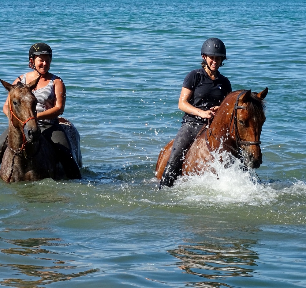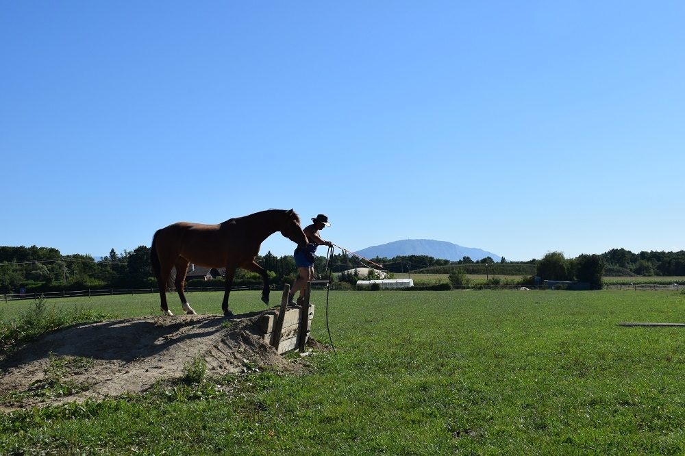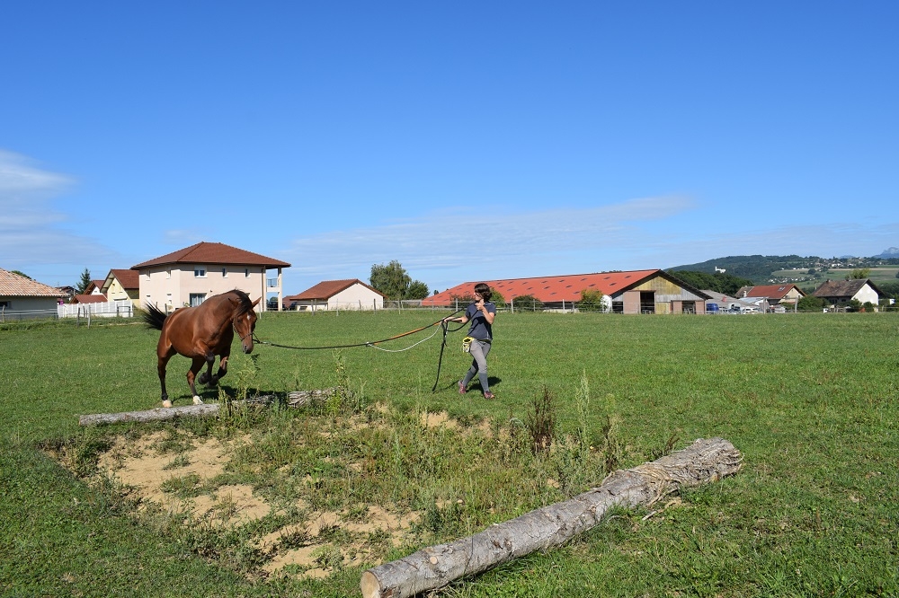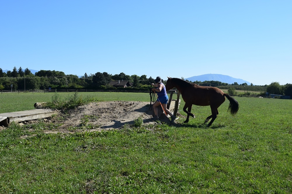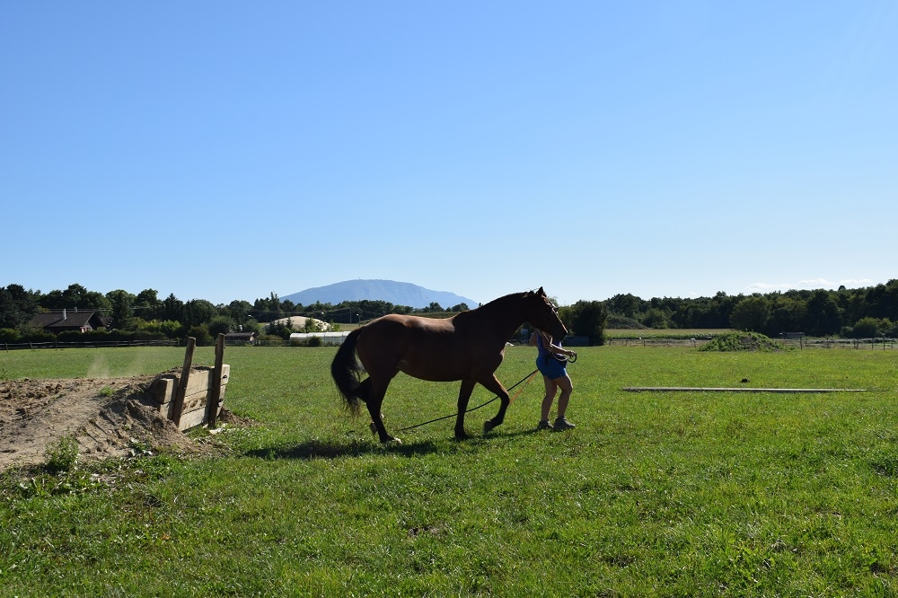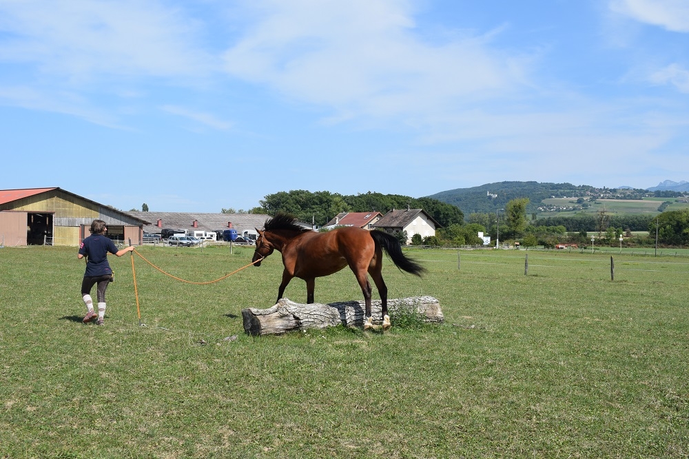 | Dire merci | Mardi, on bosse à nouveau dans la carrière (ou plutôt dans le manège parce qu'il faisait une chaleur pas possible ).On reprend toute les étapes du débourrage : faire marcher en pas à pas en demandant le levé des pieds avec la longe, désensibilisation notamment au tapis, déplacement des hanches juste en posant les doigts à la place que serait la jambes si on lui demandais, de même pour le déplacement des épaules. Elle est ultra légère c'est un régal ... bon la mienne étant vraiment à sang froid elle n'aura pas bougé de la matinée. Je finis quand même par monter dessus en licol étho et la prof m'explique les principes. On refait de la flexion (d'abord à pieds puis à cheval). Bon je n'ai rien comme photo parce que ça faisait tout son dans le manège ![]() On a refait de la théorie. Et l'après-midi, on a filé à cheval au lac. Après s'est perdu dans les bois,... On arrive enfin - contente ? Moi ? ![]() ![]() Sa grande passion s'est de taper dans l'eau avec l'antérieur ![]() ![]() Sur le chemin du retour. Des pays plats : ça nous change de chez nous ![]() Message édité le 30/08/17 à 15:15 |