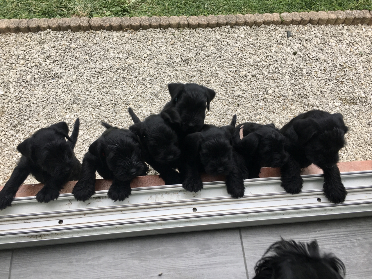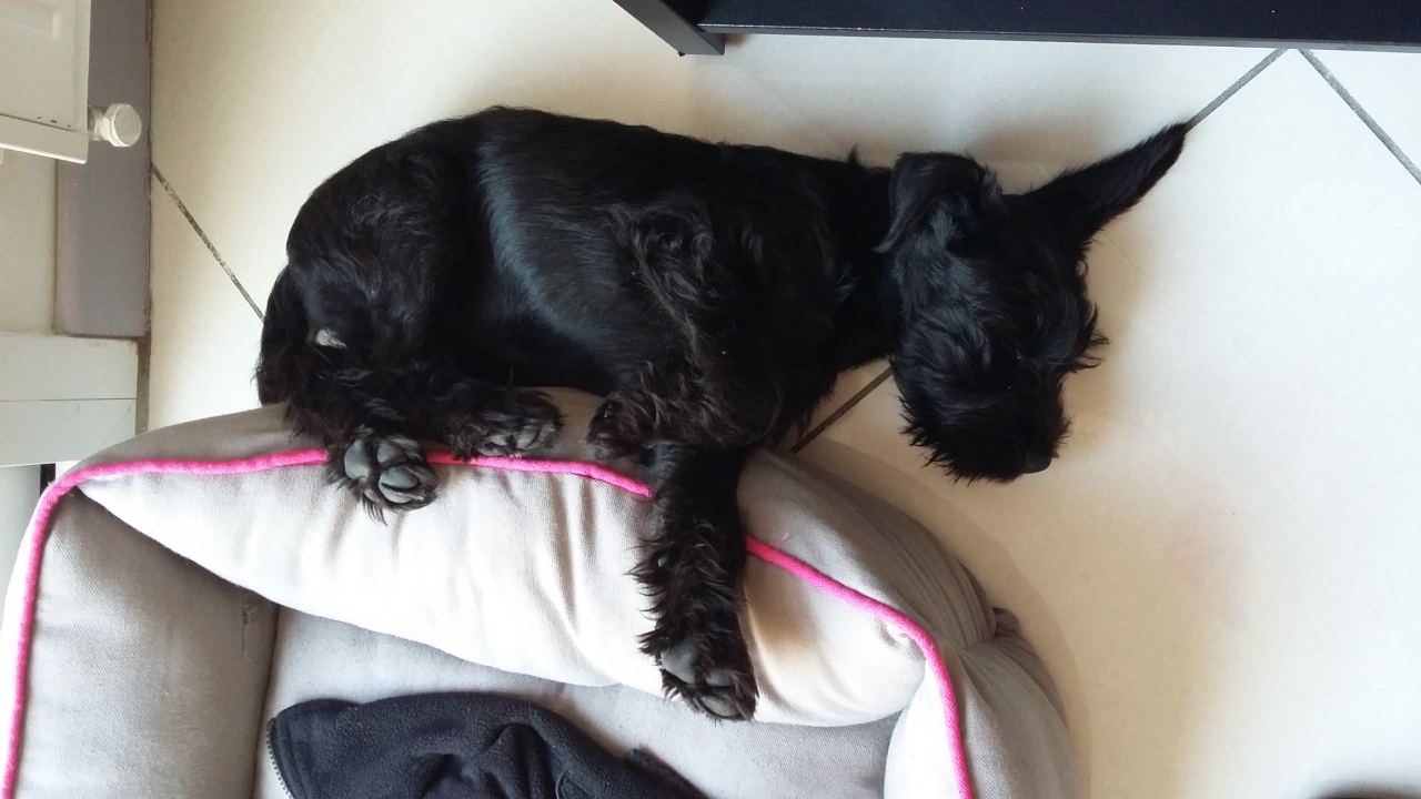 | Dire merci | C'est un schnauzer moyen noir. ![]() Photo de la maman ![]() C'est un petit mâle que je récupère. D'après son éleveur, il devrait être cool. Il m'a réservé le plus tranquille de la portée. |
