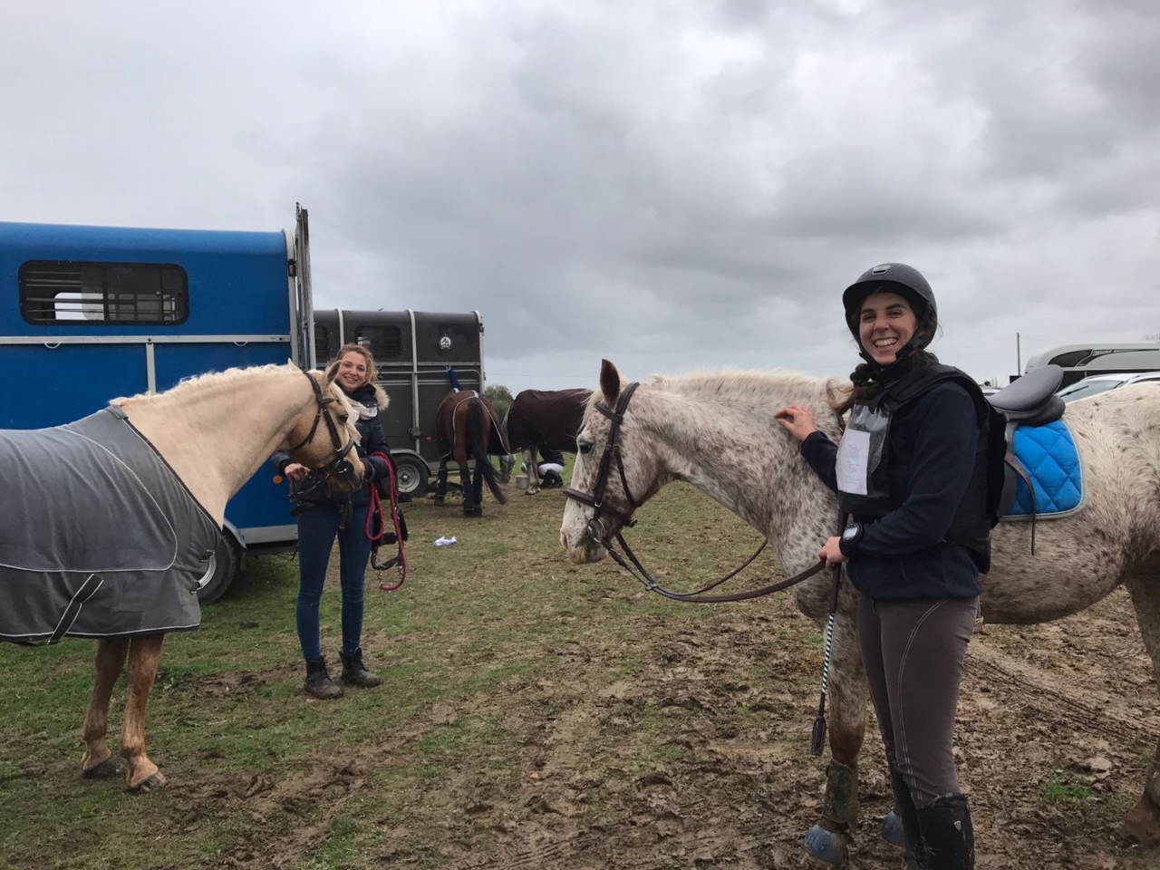 | Dire merci | Ce weekend c’était donc notre tout premier CCE ! Ma prof est venue nous chercher le samedi en fin d’aprem. On embarque la poulette, direction Cysoing pour une petit cours et une nuit sur place avant notre grosse journée du lendemain. Détente dans la grande carrière, et remise sur les barres avec passage de sous-bassement. Rien à redire, elle est exemplaire et on se fait une super bonne séance. Je desselle et l’installe pour la nuit. Je stressais qu’elle ne se sente perdu sans son copain qui nous accompagne toujours. Et en fait non. Elle rentre calmement au boxe et mange tranquillement son foin. ![]() Le lendemain, rendez-vous à 5h aux écuries, sous une pluie battante ! On nourrit, on attelle le van et on prépare les poneys. Poulette voyagera avec un magnifique poney entier palomino qui lui est engagé en club2. Madame n’est pas du matin et fait sa pénible pour embarquer. Ma prof la charge cependant dans le calme en une dizaine de minutes ![]() Magique, moi j’en aurais fait du hachis. Nous voilà donc parti pour Jeumont, qu’on renommera affectueusement Gadoue-land ! On arrive de bonne heure et le miracle n’a pas lieu. ![]() Il pleut ! On fait le tour des installations pour reconnaitre les carrières de dressage et de CSO. Je selle et c’est parti pour la détente dans un pré à côté de la carrière en herbe. Ça faisait bien longtemps que je n’avais pas monté dans une carrière en herbe, alors une carrière en herbe trempée, j’étais pas super rassurée. A la fin de la détente, je la sens quand même bien. Je pars donc tranquillement dans le fond du pré, où je ne m’étais pas encore aventuré, pour m’élancer sur le carré de dressage. Pou prend peur d’un sapin à l’entrée de la carrière… ![]() Je la rassure, me fâche un peu et on rentre donc enfin. Doubler dans la longueur, premier virage et je la sens bien sur l’œil vu qu’elle n’avait jamais vu la lisse de la carrière. Je déroule ma reprise. Pas de grosse surprise : mes cercles de 20m au trot sont un poil trop court, ma transition au pas est totalement foirée et elle décale ses hanches sur mon arrêt final. Nos problèmes classiques quoi. Le reste est assez correct. Bon rien de transcendant non plus. Le dressage c’est vraiment pas notre discipline. Va falloir qu’on s’y mette sérieusement ! Je sors quand même soulagée et assez contente. Il y a encore un mois, je n’aurais jamais pensé qu’on aurait pu dérouler une reprise de dressage. Et les conditions n’étaient quand même pas optimales. J’aurais préféré faire ma reprise dans un manège plutôt que dans une carrière en herbe détrempée et sous la pluie. Bref on est dans le fond du classement mais on n’est clairement pas là pour faire un résultat. |