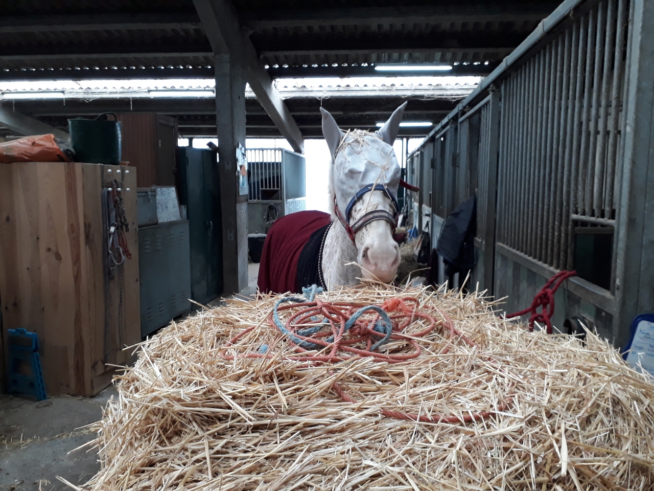 | Dire merci | Maintenant que ses yeux vont mieux, il fallait bien trouver autre chose… et donc elle a commencé à avoir un tic ambulatoire. ![]() Quand elle s’ennuie, elle tourne en rond comme une toupie dans son boxe. ![]() Discussion avec le propriétaire, la seule solution qu’on trouve, c’est de la changer de boxe. Pour la mettre à coté de son copain dans l’espoir que cela diminue son stress. Nouvelle installation : ![]() ![]() ![]() ![]() Elle semble un poil plus calme mais elle tourne toujours en rond au bout d’un certain temps quand elle doit sentir qu’il y a de l’agitation autour d’elle et que des chevaux sortent et pas elle. Ultime étape, on va voir pour essayer de descendre la séparation entre son boxe et celui de son copain de pâture/paddock pour qu’elle puisse le toucher plus facilement et comprendre que lui est toujours à côté. Bref… parfois je regrette de ne pas être rester juste au vélo. Sinon nouveau cours ce samedi. Au programme toujours la recherche d’un contact uniforme et un début de travail sur les déplacements latéraux. Franchement j’en ai chié. J’étais un peu bloqué à droite (semaine difficile avec déplacement et peu de repos et mauvaise nuit de sommeil), Poulette qui de son côté ne voulait pas céder non plus sur ce côté droit qui lui demande plus d’effort. Bref, y a du boulot. Il faut vraiment que je l’assouplisse à droite. Elle n’est clairement pas symétrique dans sa musculature. Pour se « détendre » ce midi, petit tour sur la piste du cross. Je me suis faite un peu embarquée sur le trot (le froid ça pique les fesses, plus la sensation de liberté dans les lignes droites) mais au galop, elle était vraiment royale. Enfin bref y a du boulot ![]() Et pour finir, je m'absente 30 secondes le temps de laver son mors : ![]() Heureusement que j'avais laissé son masque ! Avec mon bol, elle aurait été capable de s'en mettre dans les yeux |