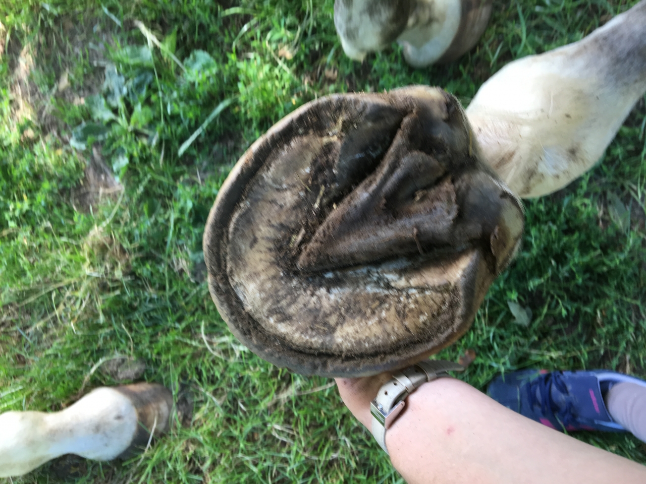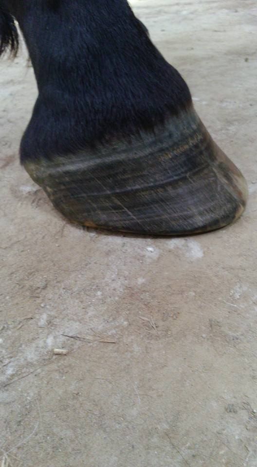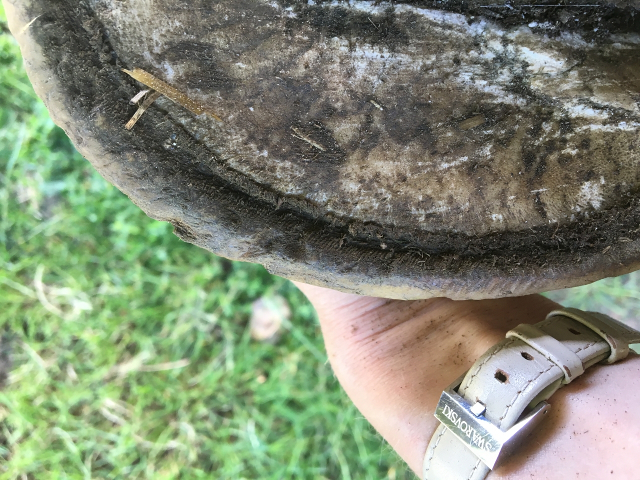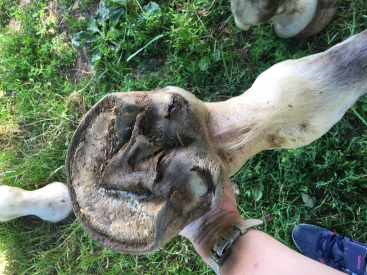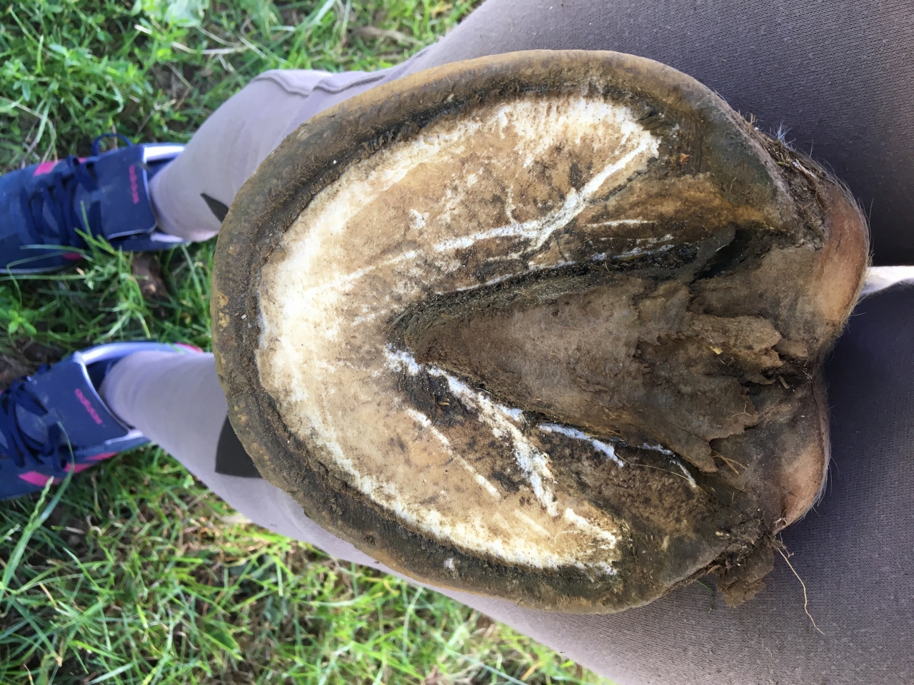 | Dire merci | Je me suis mis aux pieds nus depuis peu donc ce que je vais dire c'est de la part d'une novice... Pour moi, c'est beaucoup trop long sur toute la paroi. Il y a de quoi enlever pour au pire mettre la paroi au niveau de la sole et au mieux, la remonter un peu (ce qui évitera que la ligne blanche se creuse comme ça). Il doit avoir une bonne qualité de corne pour pas que ça pète façon seime, mais le risque de cette paroi longue, c'est vraiment d'accentuer la séparation paroi / sole. |