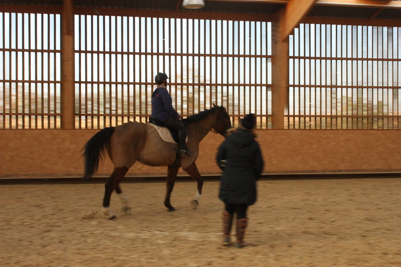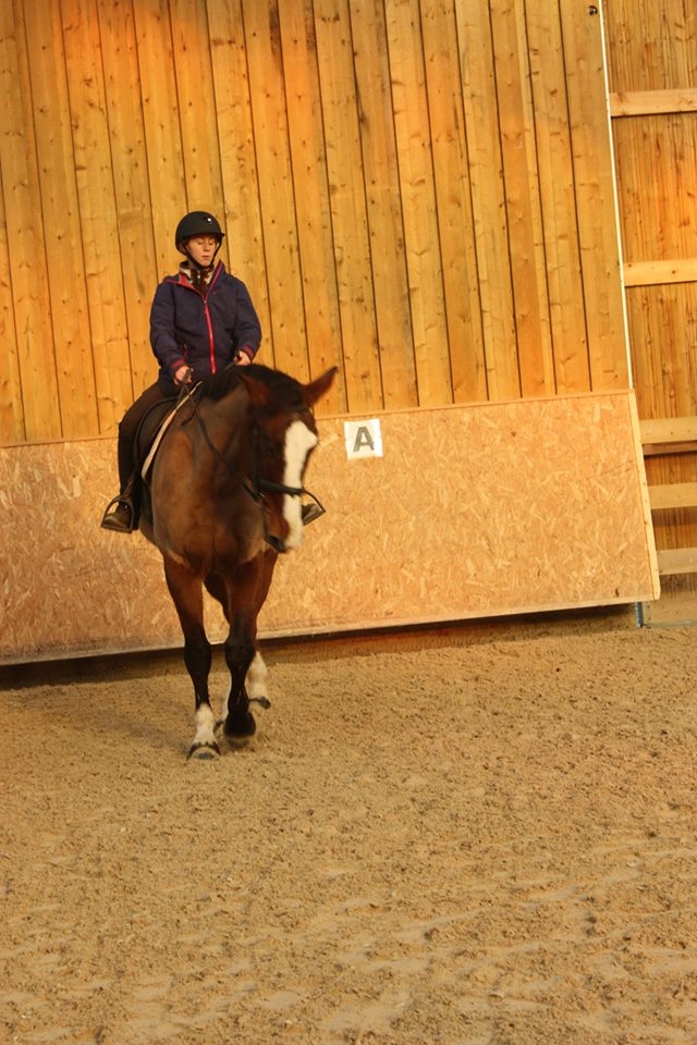 | Dire merci | Stage Sara Oliveira - 04/12 Arrivée enter midi et deux aux écuries, gros schmoutz au gros qui avait l'air en forme et content de moir !Je rejoins l'équipe qui était au chaud dans le club house, le contact est très bien passé, on a été accueillis comme des rois et les organisatrices sont au top ! Je papote un peu puis zou, on va préparer et marcher le gros Pour commencer, Sara me demande en quoi elle peut m'aider et ce que j'attends d'elle, puis elle nous regarde détendre au pas et au trot une dizaine de minutes histoire de voir comment on travaille Elle a très vite détecté notre gros problème actuel (qui n'est plus l'équiliiiibre !! WOOO bon c'est pas encore 100% réglé hein mais c'était pas le plus important ce jour-là) : ma main et la confiance du gros dans celle-ci. En fait j'ai souvent (toujours ?) la main intérieure qui revient vers moi et du coup je lui tire dans la bouche j'ai bien conscience de ce problème mais il y a des fois où je ne me rends même pas compte que ma main revient toute seule..Sara me dit qu'il faut pas que je le porte (ça c'est clair !), elle est vraiment dans l'anticipation, parfois elle me disait "ne le porte pas" alors que je le sentais même pas s'appuyer, dans ma tête je me disais "si tu savais comme on revient de loin ". Elle me dit beaucoup de prendre et rendre quand il commence à se figer, en gros pianoter sur mes doigts. J'étais pas 100% sûre du mouvement (bah oui je doute toujouurs trop), donc elle m'a fait la démonstration, j'ai posé ma main sur la sienne pendant qu'elle l'effectuait sur les rênes, bref là c'est con je saurais pas comment expliquer mais j'ai eu un gros déclic quand à ma tenue de rênes et mes actions des doigts :$Beaucoup de travail au pas sur des cercles (20m, attention à la géométrie !!!), des voltes de 10m, je me suis fait reprendre plus d'une fois car mes cercles où mes voltes étaient tout sauf ronds et symétriques , des petites épaules, et.... Des cessions à la jambe (j'en suis maudite )Doubler dans la longueur, cession à droite, et ainsi de suite, avec pour changer de main contre pli sur le petit côté et grande cession sur la diagonale, et hop on refait la symétrie Le but c'était de le gymnastiquer, pas qu'il soit parallèle à la piste, mais plutôt qu'il s'échappe un peu dans les épaules tout en engageant sous la masse, et je devais faire gaffe à ma cadence aussi ![]() Les épaules toujours devant les hanches of course, et fallait que je sois orientée dans le sens de l'incurvation du cheval : et là révélatiiion, perso je regarde toujours dans le sens où je vais mais en fait c'est clair que c'est pas logique inconsciemment je m'en doutais mais je me faisais pas assez confiance pour essayer Et rien que le fait de reculer un peu mon épaule gauche dans la cession à gauche : magique ! Idem pas avoir peur d'ouvrir la porte du côté où je veux que les épaules aillent lors de la gym au lieu de laisser les mains au garrot |