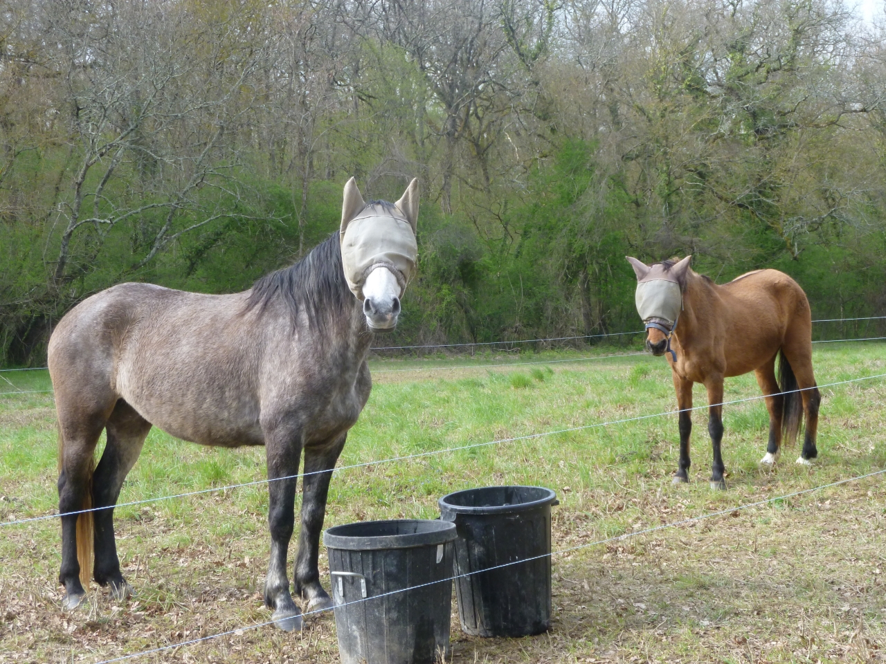 | Dire merci | Merci lonestarranchcowboy et irisetquiara39 j'en suis complètement gaga Sinon les juments vont bien et sont très contentes de leur nouveau parc plein d'herbe Lumi a déjà repris les quelques kilos qui manquait à la sortie d'hiver et Doudou se maintient en pleine forme, se tapant des galops avec les autres Quant aux deux tonneaux, toujours en forme et en formes. Valencia est vraiment un chien-cheval et d'une curiosité extrême ! Elle voit tout, sait tout de ce qui se passe aux Granges |