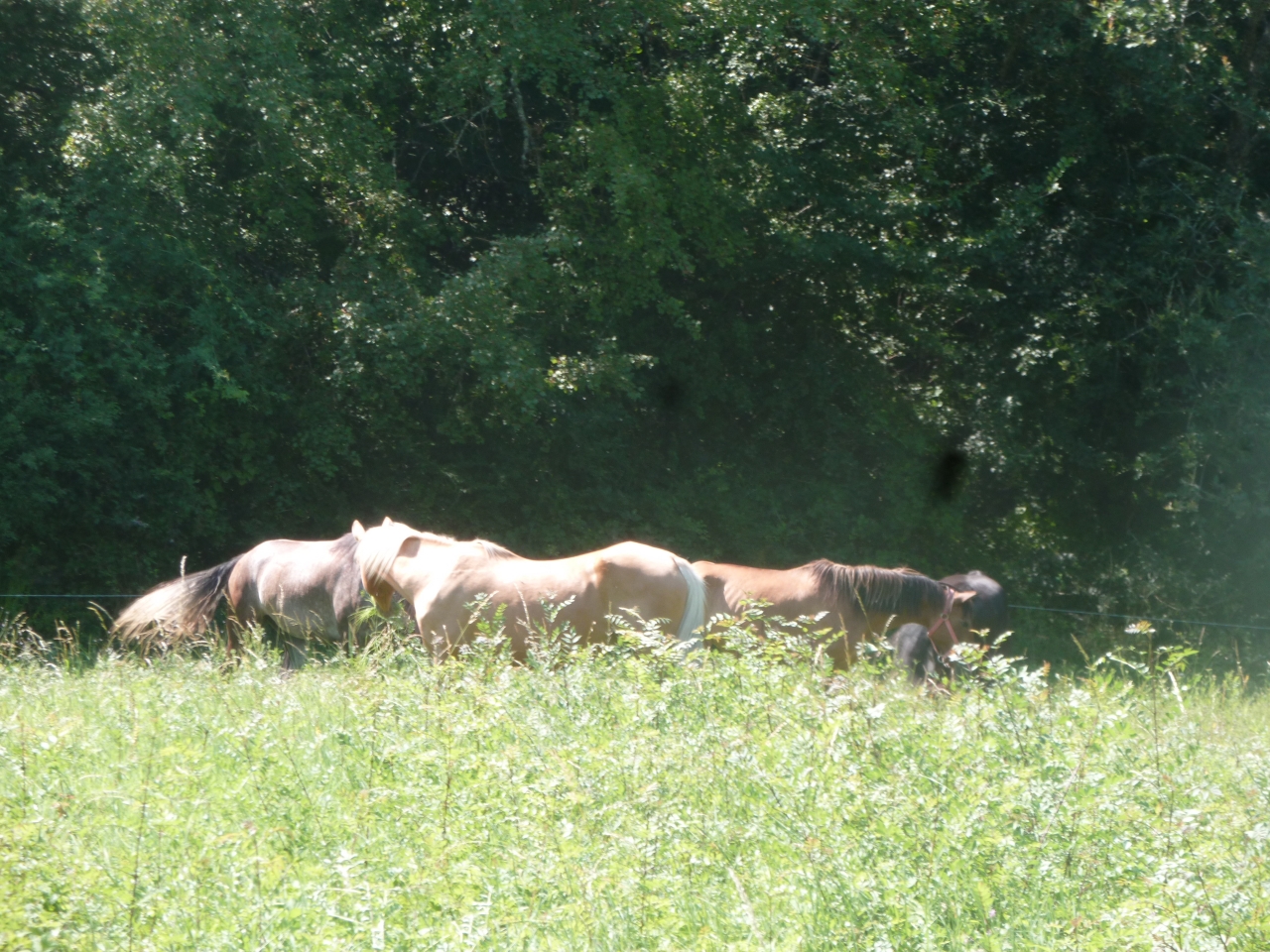 | Dire merci | je me rends compte que je suis coupable d'une rétention de photos Après avoir clôturé le nouveau pré, on a fait la transhumance ![]() ![]() La preuve. ![]() Et les 4 ensemble... ![]() Bon, elles ne sont pas très bonnes débroussailleuses car elles se concentrent sur l'herbe (pas si bêtes, les bêtes ) donc je vais devoir faire un nouveau pré plus près de la maison. C'était prévu de toute façon car là elles sont plus près de la route (pas très passante, mais si jamais quelqu'un veut voler la clôture et l'électrificateur, c'est plus facile...). Faut juste que je trouve le temps Quant à la balade, nous sommes allées jusqu'au fond de l'allée-enherbée-qui-fait-rêver (au pas, n'est-ce pas ) et puis nous sommes revenus dans les prés. Vu que c'était direction maison, Becky était tout à fait d'accord... D'ailleurs à un moment, S. a décidé de trotter dans le pré et je voyais bien le moment où Becky l'embarquait , mais non, la chaleur a eu raison de son enthousiasme... Valencia a commencé à s'exciter quand Becky l'a dépassée au trot car je ne voulais pas qu'elle suive au trot sinon ça allait finir en course, les deux raides embarquées Je l'ai tournée en cercle, ce qui l'a un peu vexé, donc j'ai eu droit à deux petites levades, mais après elle s'est contenue même si on n'a fait que du pas, donc contente de son comportement. Voilà, on a survécu et on risque de remettre ça cette semaine... ![]() |