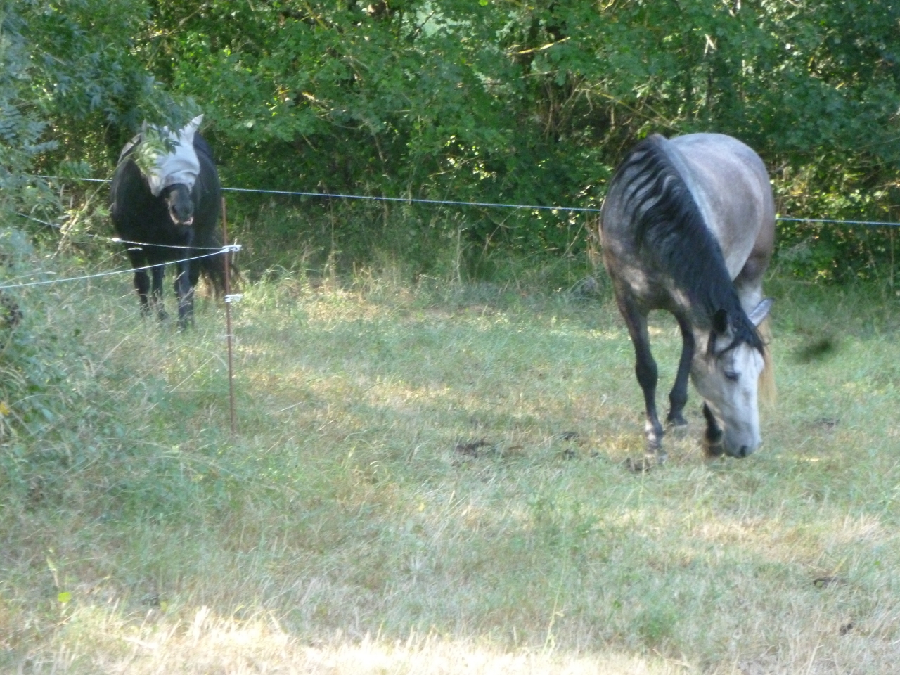 | Dire merci | coucou ![]() ça y est, je suis de retour après mon voyage autour du pré En fait ça a l'air grand mais c'est un pré de 2ha "seulement", et encore je n'ai pas tout clôturé car le sol était comme du béton. Heureusement il a plu depuis donc j'ai pu élargir un peu déjà leur partie, mais il y a toute une bande de ronces où elles n'iront pas. Elles y sont bien quand même, il y a de quoi se nourrir et de quoi se promener ![]() |