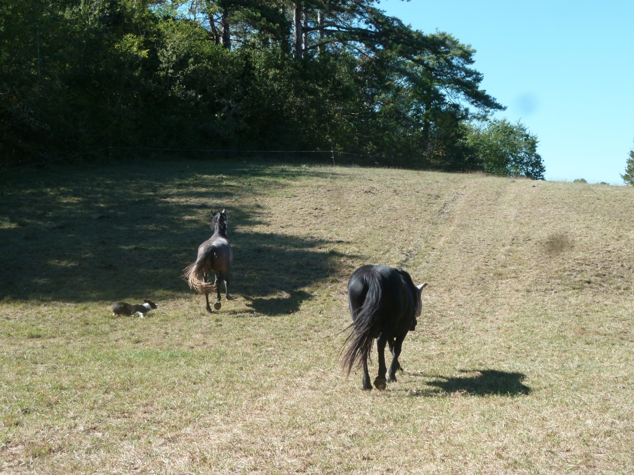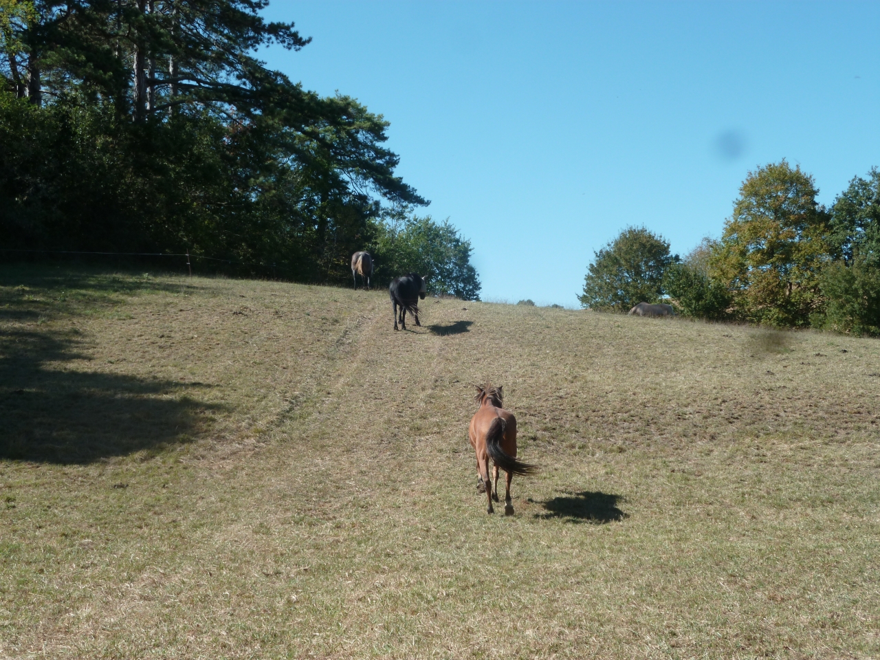 | Dire merci | lilou et laure40 , c'est un coin ma-gni-fique, je suis bien d'accord et je suis en même temps bien consciente de la chance que j'ai d'avoir mes chevaux ici Bon, les juments profitent de leurs vacances pour manger et faire des aller-retour sur la butte, question de garder la ligne vu que leur proprio indigne ne les sort plus depuis 15 jours déjà la "butte" en question ![]() Valencia et Becky montent la butte... ![]() Doudou réfléchit... se rend compte qu'elle est toute seule et... ![]() se lance au trot pour rejoindre les autres ![]() ![]() |