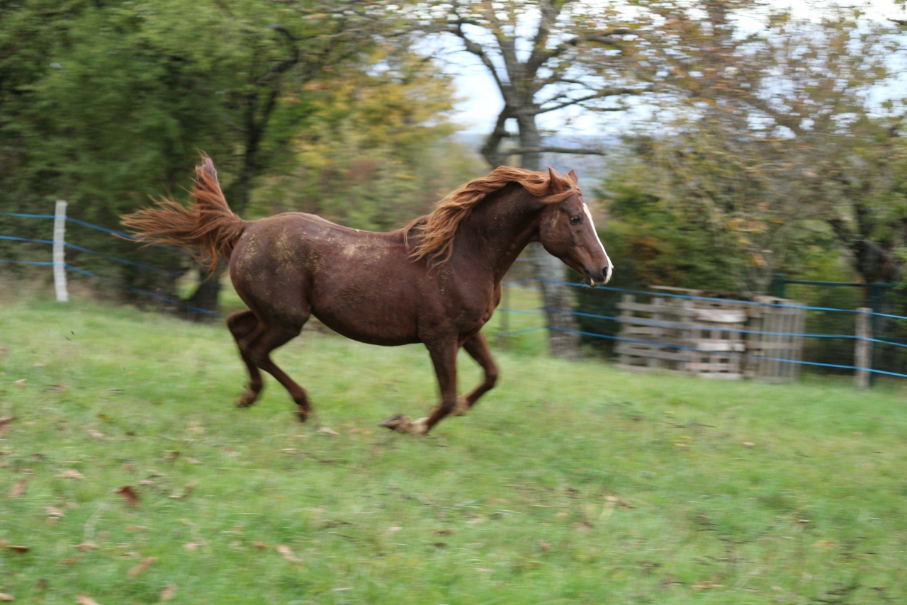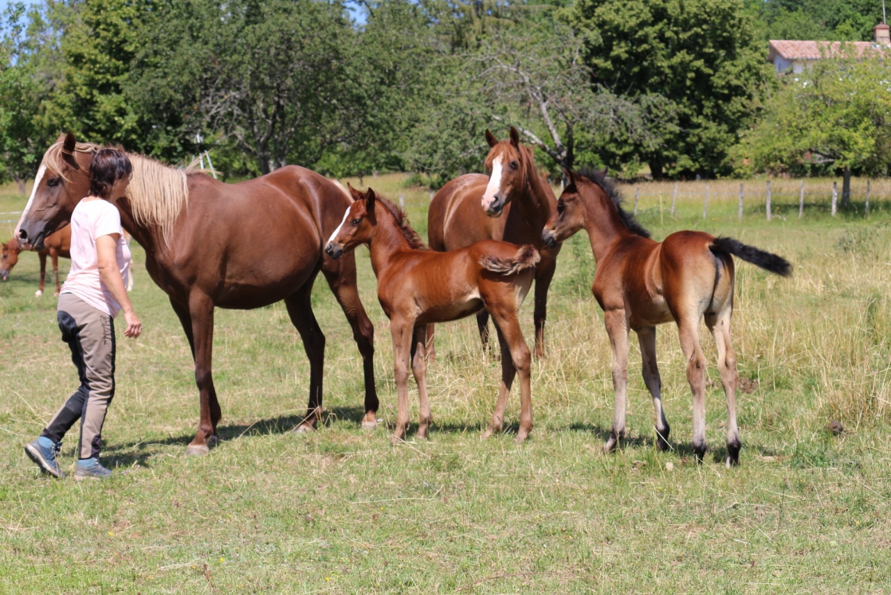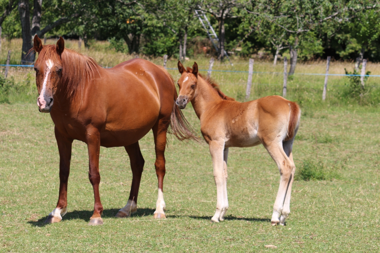 | Dire merci | C'est le cas, et ils peuvent profiter de leurs mamans jusqu'au printemps (mars ou avril). On ne fait saillir nos juments qu'un an sur 2, ce qui nous permet de sevrer tardivement, et tout en douceur![]() Abiba et son fils Namran |