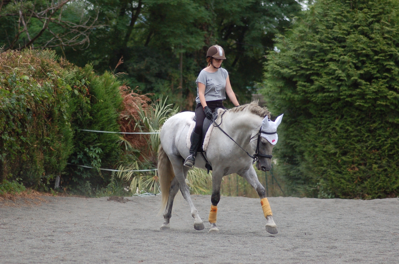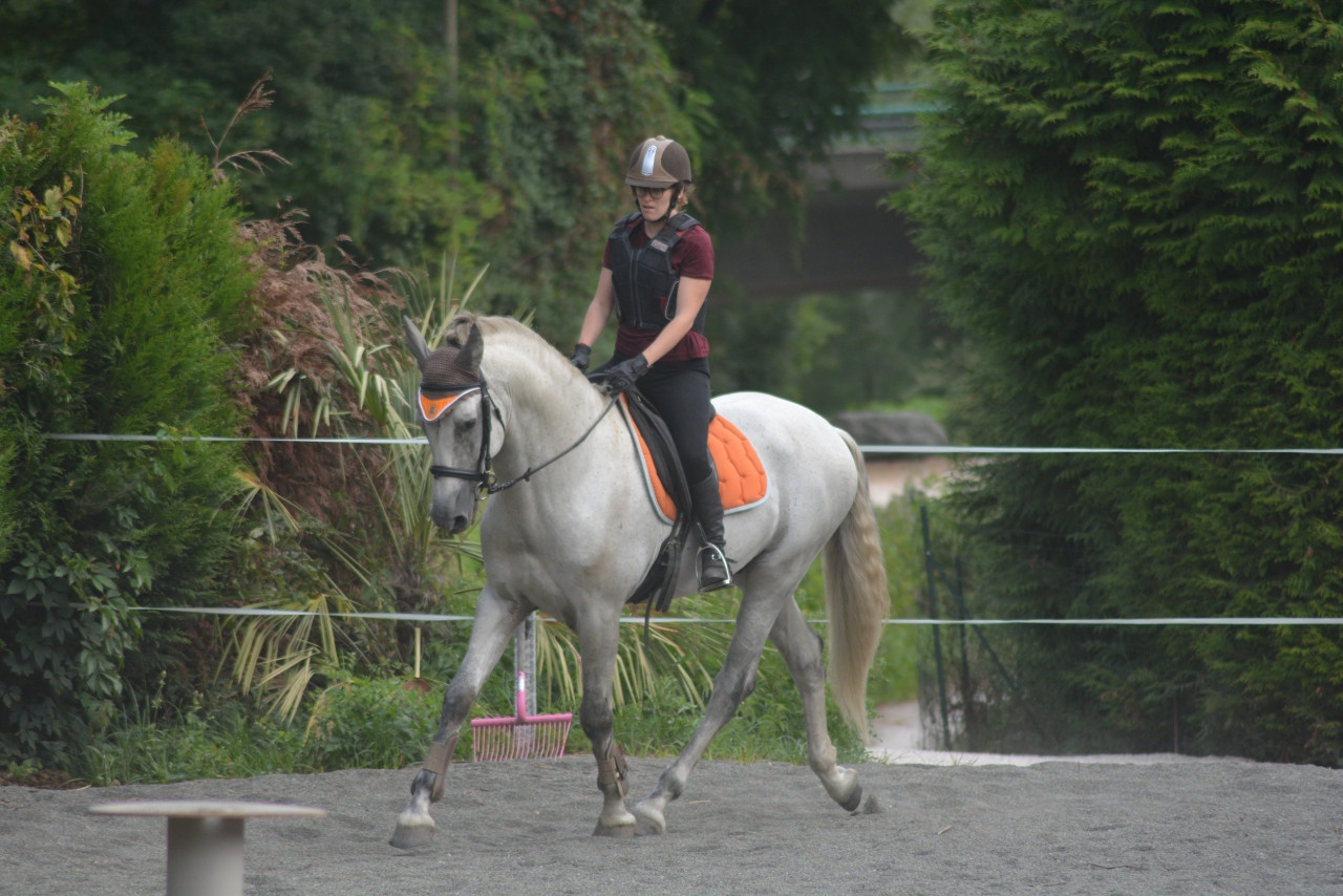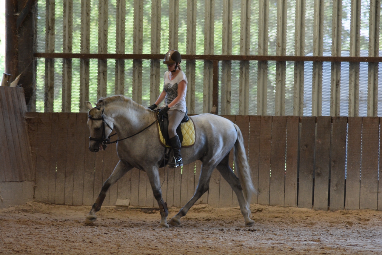 | Dire merci | Des nouvelles ! J'étais en vacances 2 semaines, et c'est à cette période que s'est fait la transition vers l'alimentation sans céréales. Il a donc foin + granulés de luzerne + CMV. A voir donc l'évolution, il rechigne un peu sa ration qui est moins ragoutante que la précédente, mais du coup il la mange lentement, c'est pas plus mal. ![]() Sinon à mon retour je suis allée prendre un cours chez un pro vers Chambéry, c'était très intéressant on a avant tout travaillé les bases, pour avoir une attitude juste, avec une longueur d'encolure et pas qu'il vienne se plaquer comme il a tendance à faire. Il a un dos très faible actuellement donc le but est déjà de bien travailler dans le bon sens, il a beaucoup de mal à droite donc on essaie aussi de retrouver un peu de symétrie. Un peu décue sur le travail latéral où j'ai eu beaucoup plus de mal, avec un cheval un peu froid à la jambe, mais on était aussi tous les deux bien fatigués, on a pas l'habitude de travailler intensément pendant une heure ![]() Il me fait beaucoup travailler sur ma jambe intérieure, que j'avais tendance à négliger, c'était presque une vraie révélation pour moi ![]() J'ai pas beaucoup de photos par contre ![]() Trop enfermé là ![]() Mieux dans son dos (fin de séance) ![]() Et sinon ce matin on a refait de l'obstacle ! Ca y est je crois qu'il y prend goût. C'est pas notre discipline de prédilection mais j'aime bien varier les exercices Première fois qu'on enchaine plusieurs obstacles ![]() Avec le look de poney de concours même ! ![]() Youhou petite croix pour commencer ![]() |