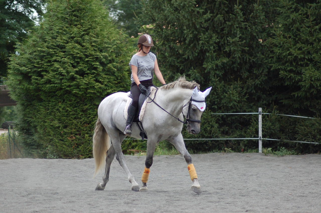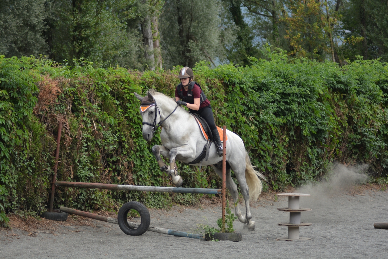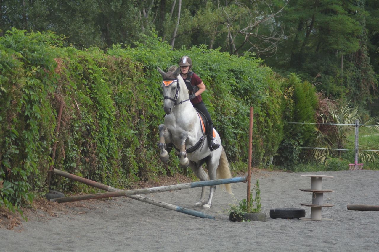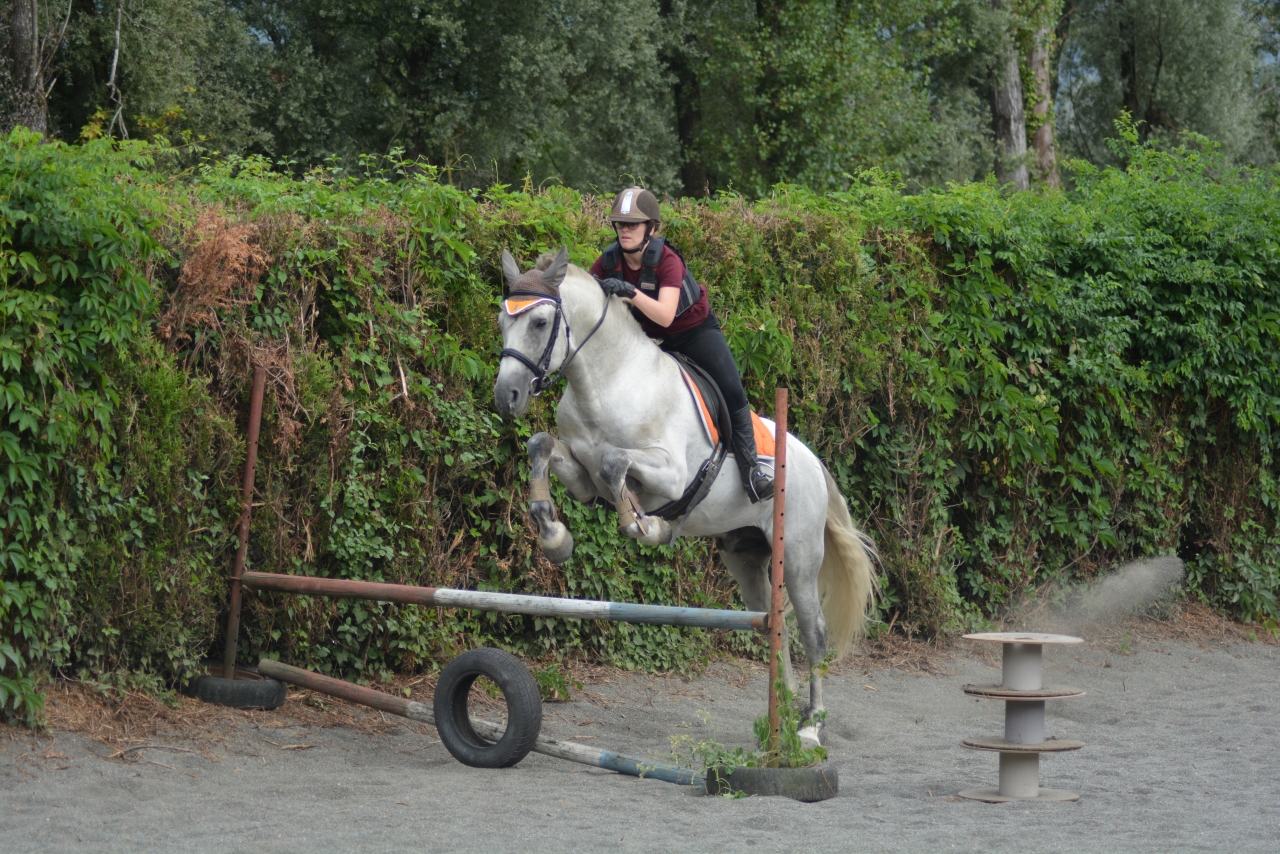 | Dire merci | Des nouvelles ! J'étais en vacances 2 semaines, et c'est à cette période que s'est fait la transition vers l'alimentation sans céréales. Il a donc foin + granulés de luzerne + CMV. A voir donc l'évolution, il rechigne un peu sa ration qui est moins ragoutante que la précédente, mais du coup il la mange lentement, c'est pas plus mal. ![]() Sinon à mon retour je suis allée prendre un cours chez un pro vers Chambéry, c'était très intéressant on a avant tout travaillé les bases, pour avoir une attitude juste, avec une longueur d'encolure et pas qu'il vienne se plaquer comme il a tendance à faire. Il a un dos très faible actuellement donc le but est déjà de bien travailler dans le bon sens, il a beaucoup de mal à droite donc on essaie aussi de retrouver un peu de symétrie. Un peu décue sur le travail latéral où j'ai eu beaucoup plus de mal, avec un cheval un peu froid à la jambe, mais on était aussi tous les deux bien fatigués, on a pas l'habitude de travailler intensément pendant une heure ![]() Il me fait beaucoup travailler sur ma jambe intérieure, que j'avais tendance à négliger, c'était presque une vraie révélation pour moi ![]() J'ai pas beaucoup de photos par contre ![]() Trop enfermé là ![]() Mieux dans son dos (fin de séance) ![]() Et sinon ce matin on a refait de l'obstacle ! Ca y est je crois qu'il y prend goût. C'est pas notre discipline de prédilection mais j'aime bien varier les exercices Première fois qu'on enchaine plusieurs obstacles ![]() Avec le look de poney de concours même ! ![]() Youhou petite croix pour commencer ![]() |