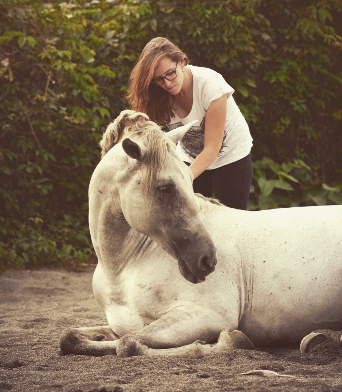 | Dire merci | Merci fantomette Petite photo d'avant hier, un chouette moment de fin de séance où on a retravaillé le coucher sur demande, qui s'est transformé en grosse séance de gratouilles, et qui a transformé le poney en chameau en pleine béatitude, il était adorable, c'était trop bien ![]() |