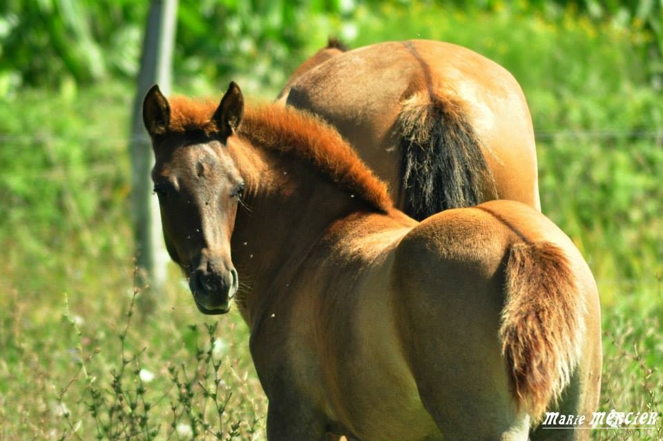 | Dire merci | Non ça m'étonnerait pas Je trouve que Youpi ressemble de plus en plus à Doudou Par contre elle avait quel caractère jeune la Doudou ? Car la Youpi faut pas la faire chier ! Madame est la patronne de son pré et vaut mieux pas la contrarier Titi montre enfin qu'il est le fils de Becky, il y a encore quelques mois c'était une crevette tardive mais la il nous a montré son bidon héréditaire Pour Fairy c'est le portrait de son père (la robe en moins) ! |