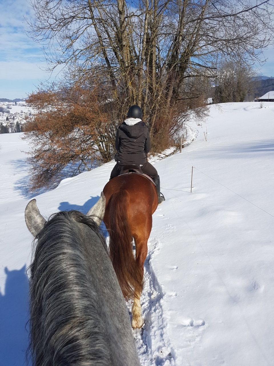 | Dire merci | Hello! Pas trop de nouvelles ces dernières semaines mais comme on dit pas de nouvelles bonnes nouvelles ! On a rien fait de spécial ces derniers temps, on se réjouit de sortir de l’hiver parce que ça devient long ! En attendant on se balade et on continue les cours de dressage et gymnastique de temps en temps. J’ai commencé à travailler aux longues rênes aussi dans le but de le mettre à l’attelage un jour et avant ça de lui faire herser le manège parce que j’en ai marre de le faire à la main après qu’il se soit défoulé dedans 😂 Sinon la période où il était très tendu surtout en manège semble être passée, on se retrouve un peu 😄 |