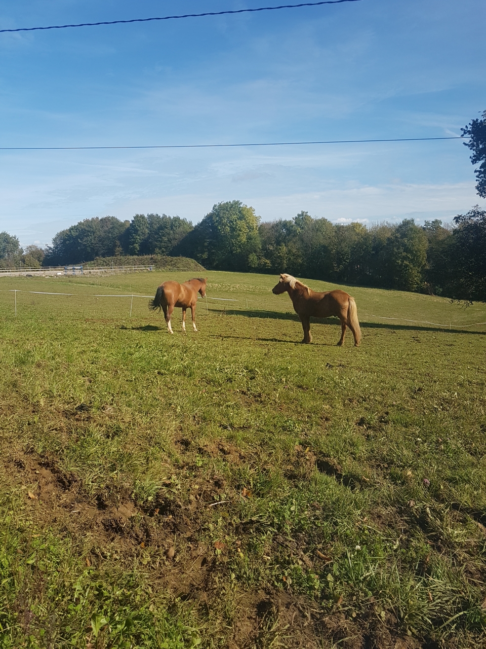 | Dire merci | décidément le temps passe à une vitesse folle... Nous voila déjà début octobre.. Et les chevaux ont démangés dans leur nouvelle pension dimanche dernier... Et finalement, la gérante à pu nous dégoter un pré pour jarpur ET pour cobra !! ![]() Du coup coco reste au pré pour l'hiver ! Je suis super contente ! A moi les pieds mouillés, le froid et le poney plein de boue. Petit récap minceur coté coco : On s'en sort finalement pas trop mal. Coco a gardé un peu près la ligne malgré 3 mois de pré, pas beaucoup de boulot et des festins de pommes... ![]() Elle ne boite plus du tout. Leur nouveau pré est top de la pente... ![]() Des bois... le petit chemin amène à leur cabane. ![]() Et du plat pour faire la sieste... ![]() Jarpur à découvert la grande carrière... ![]() Et il commence a faire son poil d'hiver...D'ailleurs tout le monde dans la nouvelle pension est étonné de l'épaisseur de poils qu'il a déjà mis.. Mais Heuuu... comment vous dire... Aujourd'hui : ![]() Et dans quelques mois il ressemblera à ça... ![]() ![]() |