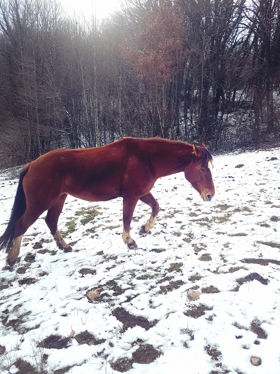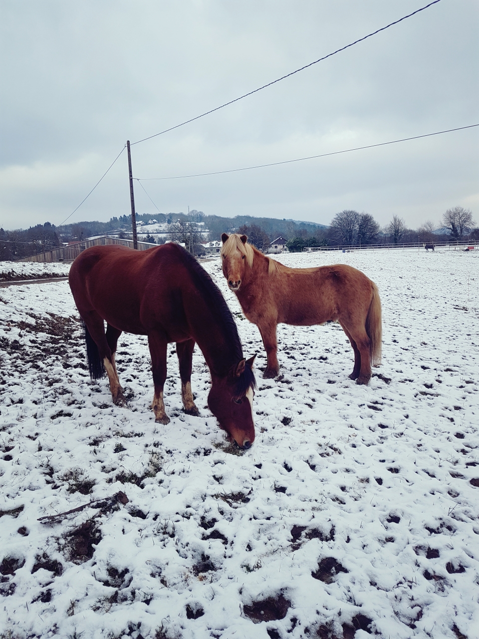 Bon et sinon je suis allée voir les poilus ce week-end... Tout d'abord Miss coco... a tenté une évasion pour rester tranquille au pré... mais ça grimpe et sa glisse donc elle n'allait pas bien vite ![]() Et hop attrapée... Cobra grognon est de sortie ![]() ![]() Depuis quelques jours elle a plein de gnons sur la tête, dont une grosse balafre au dessus de l’œil. Je ne sais pas si elle se gratte/cogne ou si Jarpur la malmène (mais ce n'est pas son genre...) A surveiller ! ![]() Ma soeur prend jarpur. Et nous allons brosser. Cobra a l'air fatiguée et elle est super grognon. Elle fait même mine de me latter au pansage vers la croupe, elle envoie le pied en prenant garde de m'éviter mais bon... Elle se prend une bonne soufflante quand même ! Nan mais oh ! Un coup d'étrille sur le cul pour lui faire bouger ses fesses et une petite sonnante. Je n'aime pas du tout ses menaces. Dès janvier je reprend un cours avec ma monitrice étho... Je crois qu'il y a des choses a remettre au clair... Bref vu les conditions, je me dis qu'une petite séance a pied ne fera pas de mal. Ma soeur monte jarpur a nous allons dans le manège. Message édité le 05/12/17 à 17:12 |